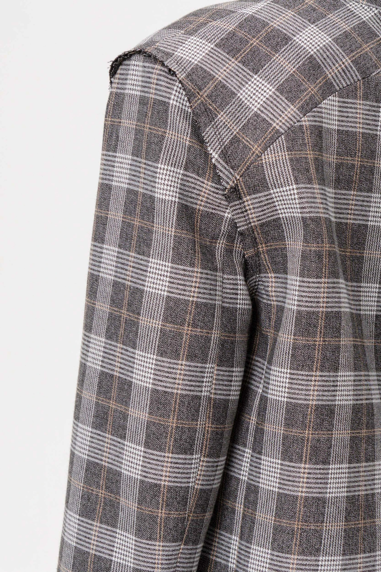 Комплект-двойка из укороченного оверсайз жакета в клетку с необработанными проймами и трикотажных облегающих брюк-клеш.