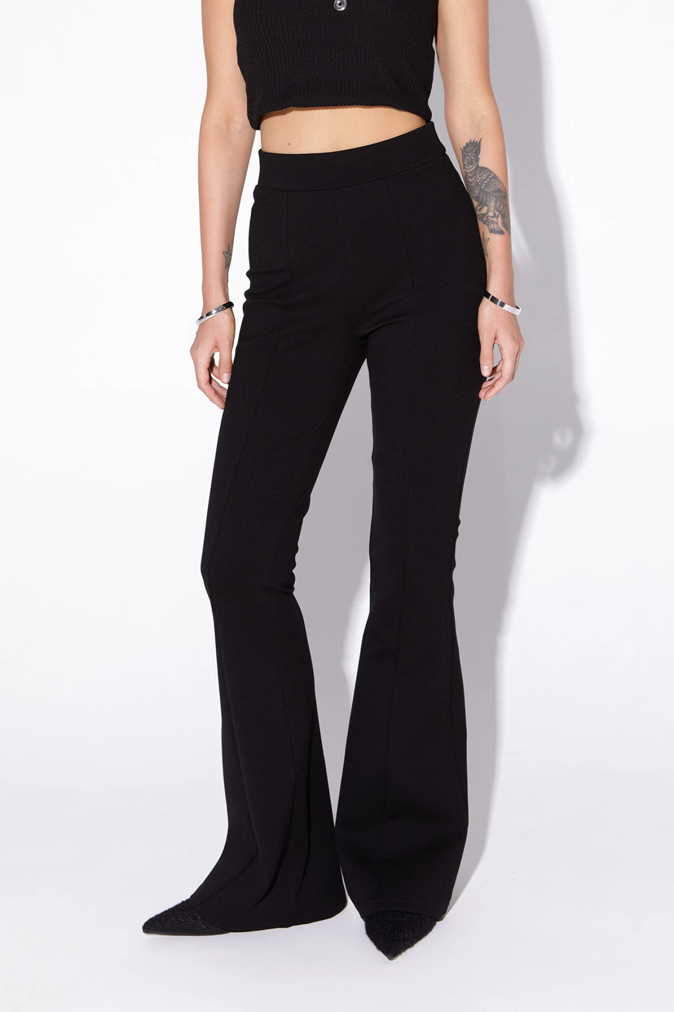 Комплект-двойка из приталенного жакета со складками из фактурной ткани «букле» и трикотажных облегающих брюк-клеш.