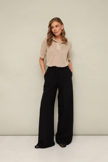Стильный 2-х предметный комплект, состоящий из поло и брюк. Поло с отложным воротником с цельнокроеной стойкой, V-образный вырез горловины обработан притачными планками. Короткие втачные рукава. Брюки прямого силуэта с боковыми наклонными карманами, спереди обработана имитация гульфика. Пояс притачной на резинке, для регуляции размера. Длина брюк разработана с учетом усадочных свойств натуральной ткани.