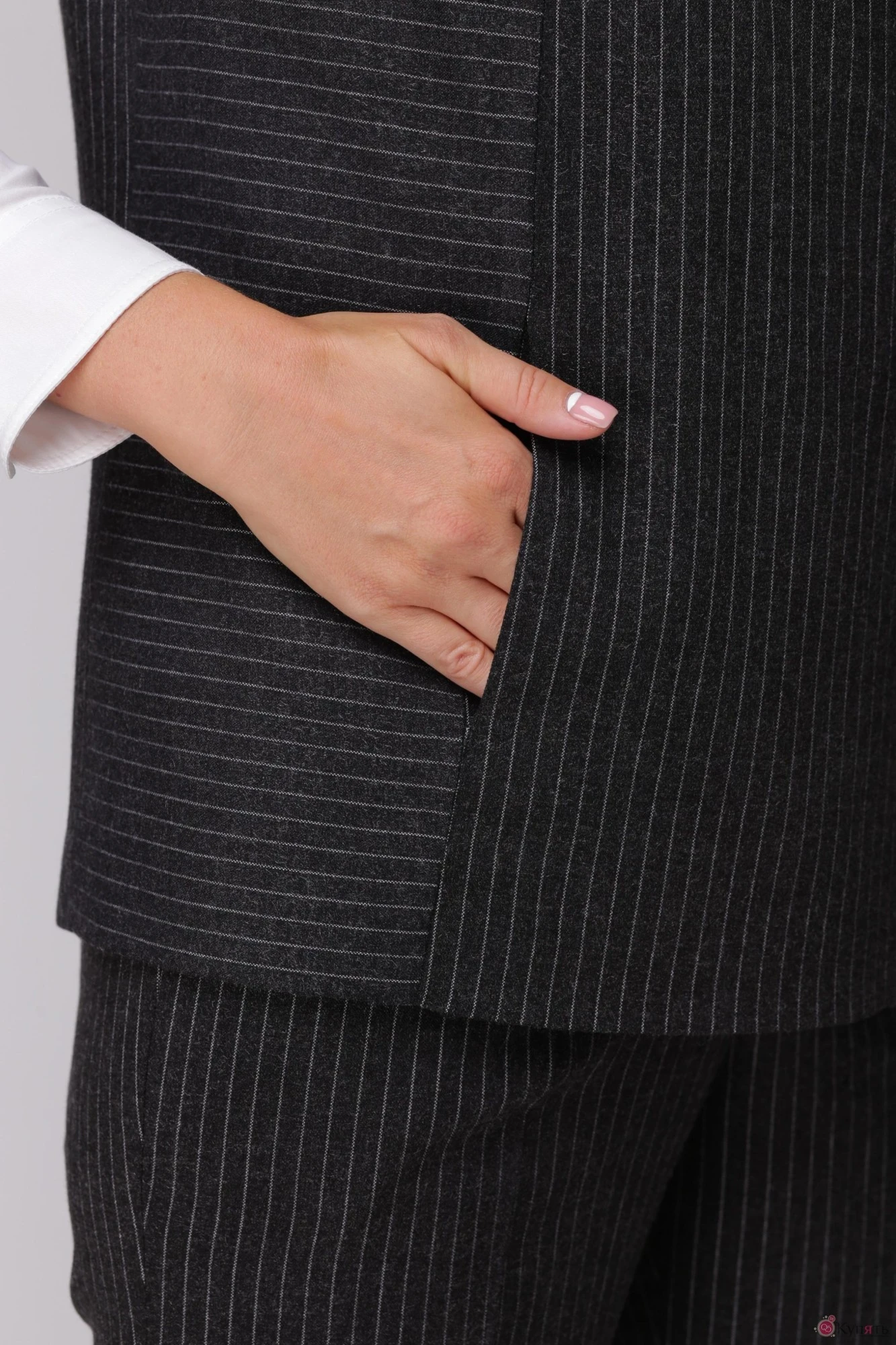 Женский стильный 2-ух предметный костюм: жилет и брюки, выполненные из костюмной ткани. Жилет прямого силуэта со смещенной застежкой на тесьму-молнию. На полочке обработан внутренний карман. Жилет на подкладке. Брюки классического кроя слегка заужены к низу, длиной до щиколотки. Пояс притачной, застегивающийся на потайной крючок, пуговицу по поясу и на брючную молнию по гульфику. Сзади на брюках прорезные карманы с листочкой. На поясе предусмотрены шлевки для проведения ремня. Также в брюках обработаны боковые наклонные карманы.