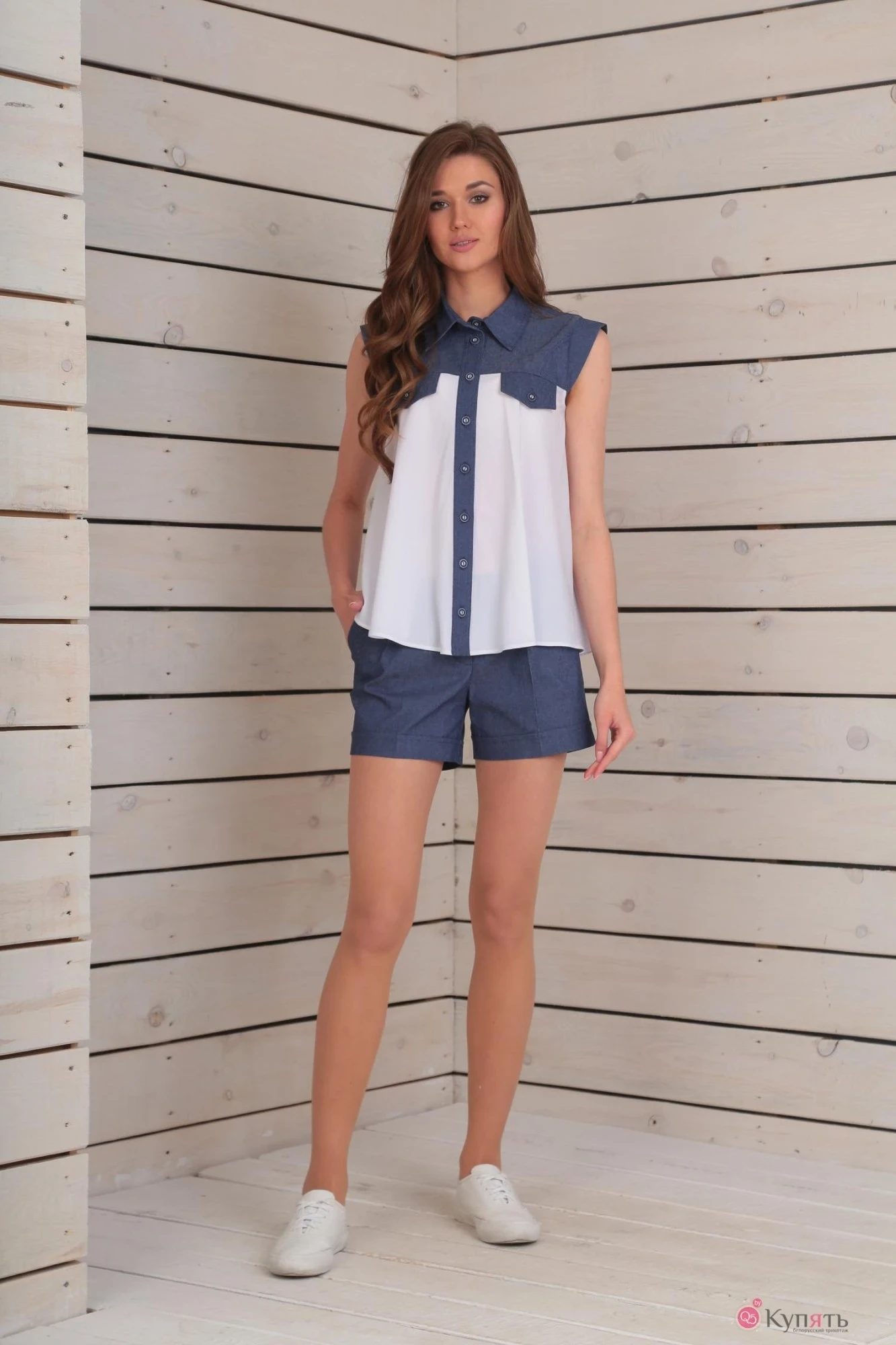 Костюм, состоящий из блузона и шорт. Силуэт: расклешённый. Вид застежки: застежка центральная на петли-пуговицы.