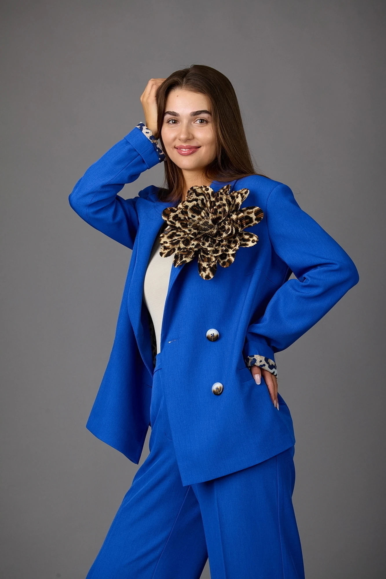 Комплект женский, состоящий из жакета и брюк, выполнен из стрейчевой костюмной ткани на подкладке. Двубортный жакет прямого силуэта с вытачками по переду. Карманы с листочками. Воротник - пиджачного типа. В среднем шве спинки - планка, застегивающаяся на пуговицы. Рукава - втачные, двухшовные. Застежка на 2 пуговицы и одну потайную. Цветок-брошь входит в комплект. Широкие брюки с поясом и карманами. По бокам пояса-резинка.Застегиваются по переду на молнию и пуговицу.