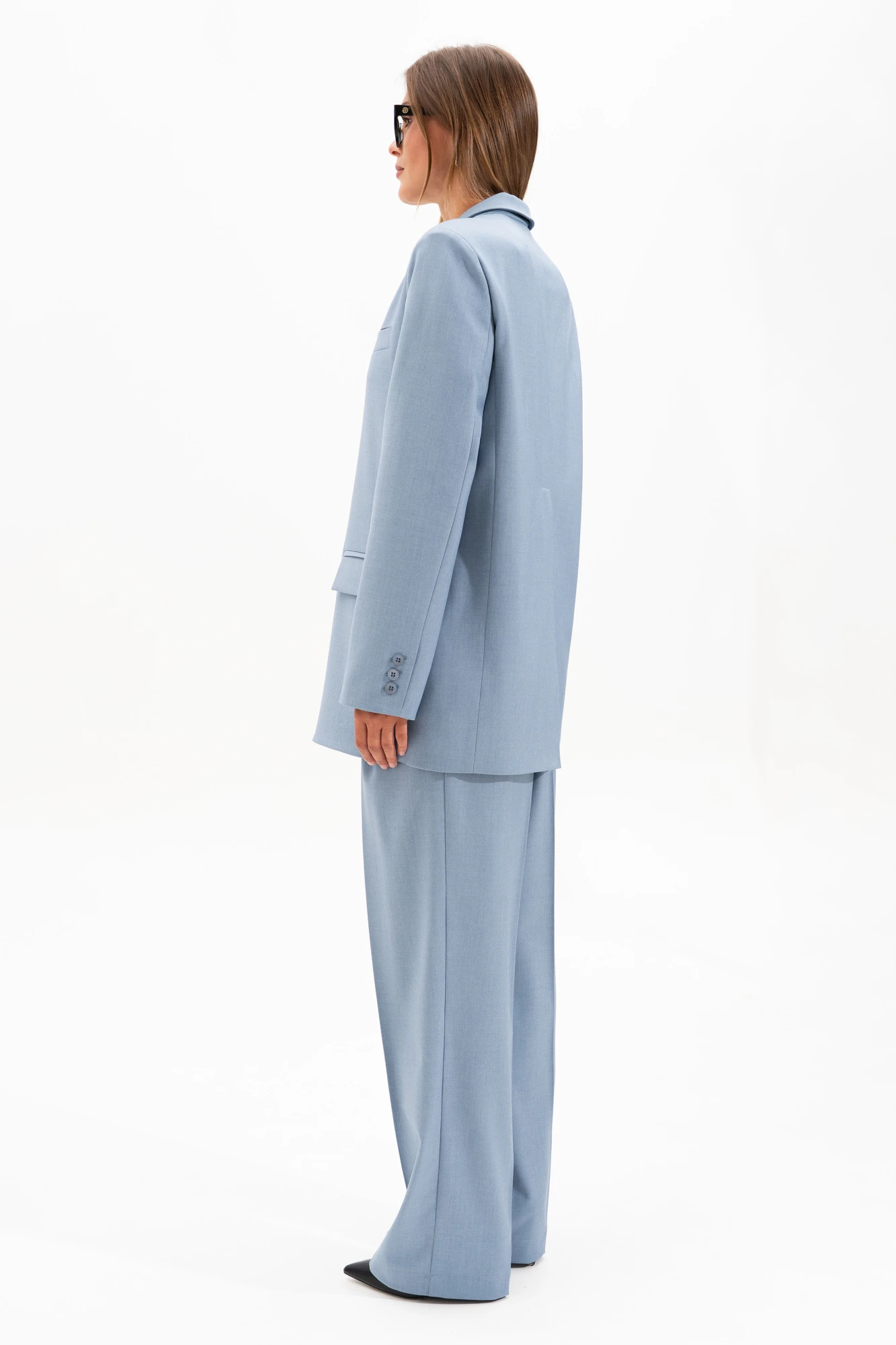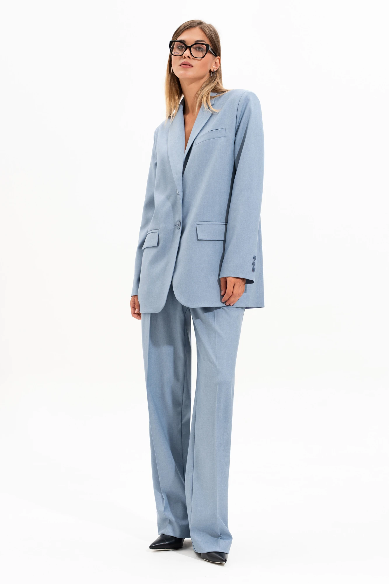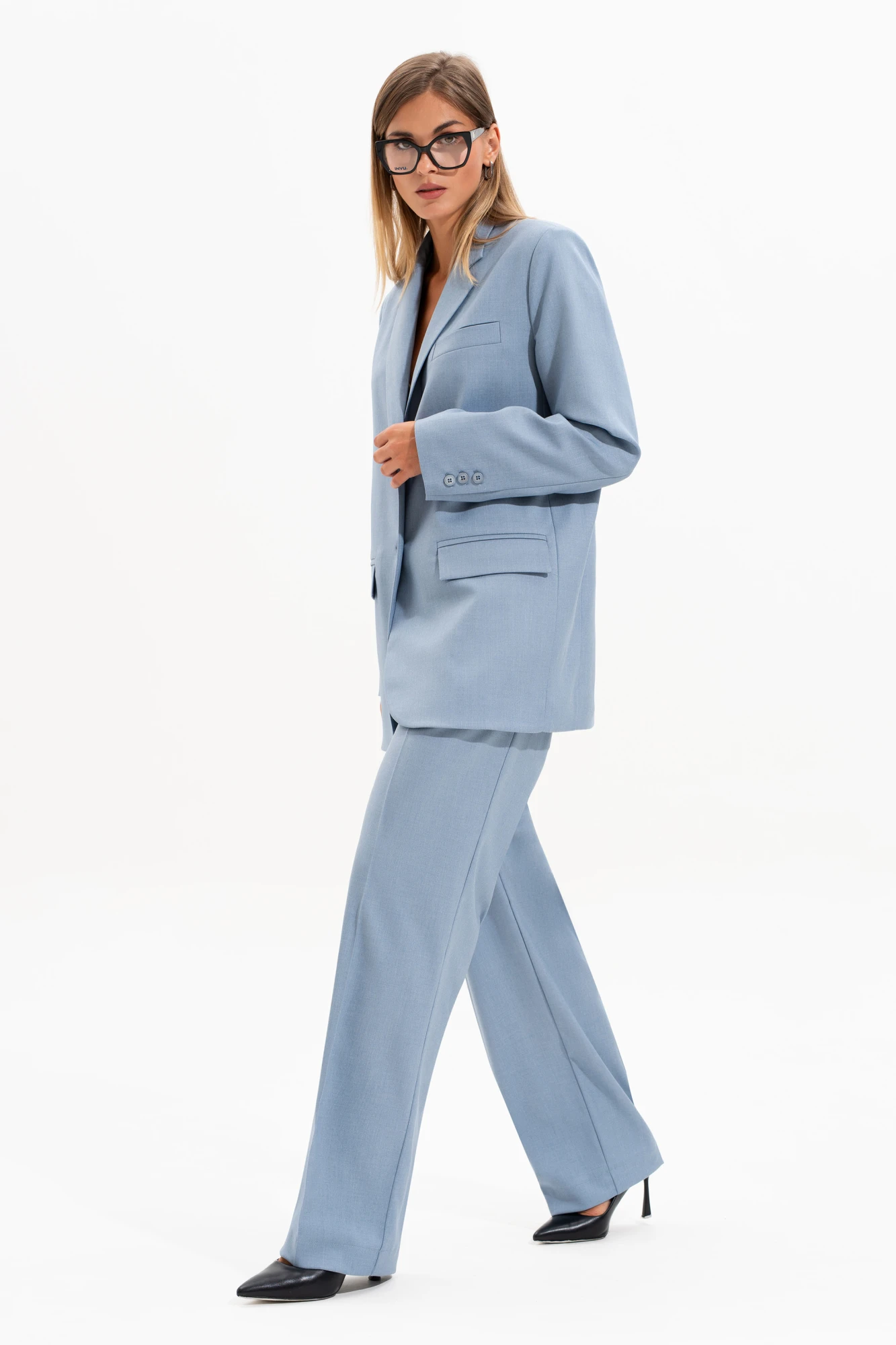 Брючный костюм. Идеальный крой и посадка. Жакет свободного силуэта, с цельнокроеными бочками, на поливискозной подкладке. Воротник пиджачного типа с отложным лацканом, на левой полочке листочка. Спереди прорезные карманы в рамку с клапаном. Спинка со средним швом и высокой отлетной шлицей (40 см.). Рукав втачной , двухшовный, со шлицей и пуговицами. Брюки актуального силуэта, свободные, прямые к низу. На передних половинках заутюжены стрелки, переходящие в складку по линии талии. Застежка-гульфик, по переду боковые наклонные карманы. Пояс стабильный по переду, по задней части брюк на резинке, с настроченными шлевками и застежкой на пуговичку. Благородство этого костюма просто зашкаливает. Абсолютно современный look, делает образ острым и элегантным, олицетворяя женщину 21 века.