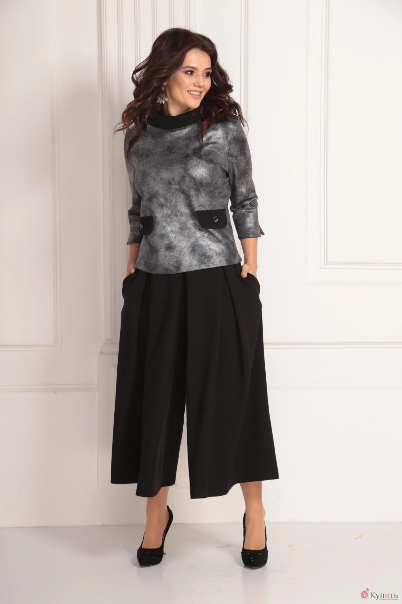 Комплект женский двух предметный предназначен для стильных молодых женщин идущих в ногу с модой. Комплект состоит из блузы и юбки-брюк (кюлоты). Верх брюк на притачном поясе по бокам со вставной резинкой. Застежка- потайная молния сзади, пояс на пуговице с петлей. По переду брюк три бантовых складки. Длина брюк 7/8. От линии талии складки застрочены на 4 см. Блуза свободного кроя. Рукава вставлены в пройму со спущенным плечом. Рукав ниже линии локтя. По горловине вставной воротник,заканчивающийся на спинке острыми уголками. По спинке застежка на пуговицу с воздушной петлей.