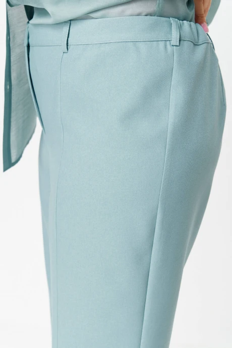 Брюки на притачном поясе со шлевками. На передних половинках брюк расположены рельефы с маленькими разрезами по низу. По спинке в пояс вставлена резинка. Застежка на молнию и пуговицу.