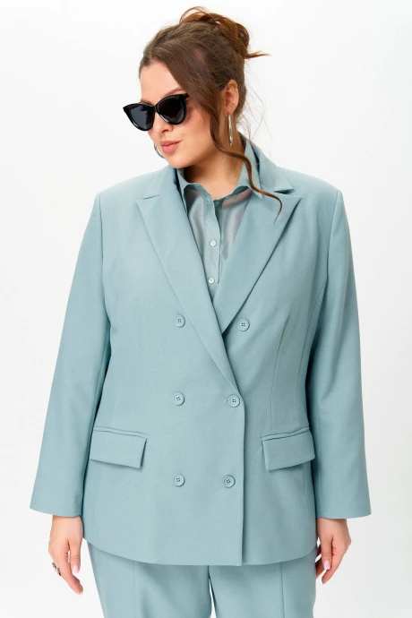 Жакет полуприлегающего силуэта, двубортный, с центральной застежкой на петли и пуговицы. Рукав втачной. Воротник пиджачного типа, отложной с лацканами. По полочке функциональные прорезные карманы с клапаном. Спинка со средним швом и шлицей.