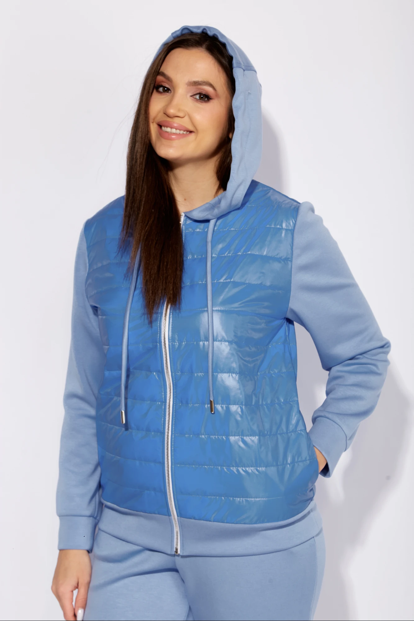 Костюм женский, 2х предметный, состоящий из куртки-бомбера и брюк. Куртка прямого силуэта. Перед и спинка выполнены из двухсторонней, стеганой на синтепоне (W100) плащевки. Карманы в боковых швах. Рукав втачной, длинный, по низу на манжете. Горловина оформлена капюшоном с кулисой. Низ на манжете. Капюшон, рукава, манжета низа и брюк из трикотажного полотна. Брюки прямого силуэта с манжетой по низу. По переду карманы и горизонтальный подрез выше колена, акцентирован нашивкой. В нижней части вертикальные подрезы. По подрезам отделочные строчки. Пояс отрезной с резинкой по кругу.
