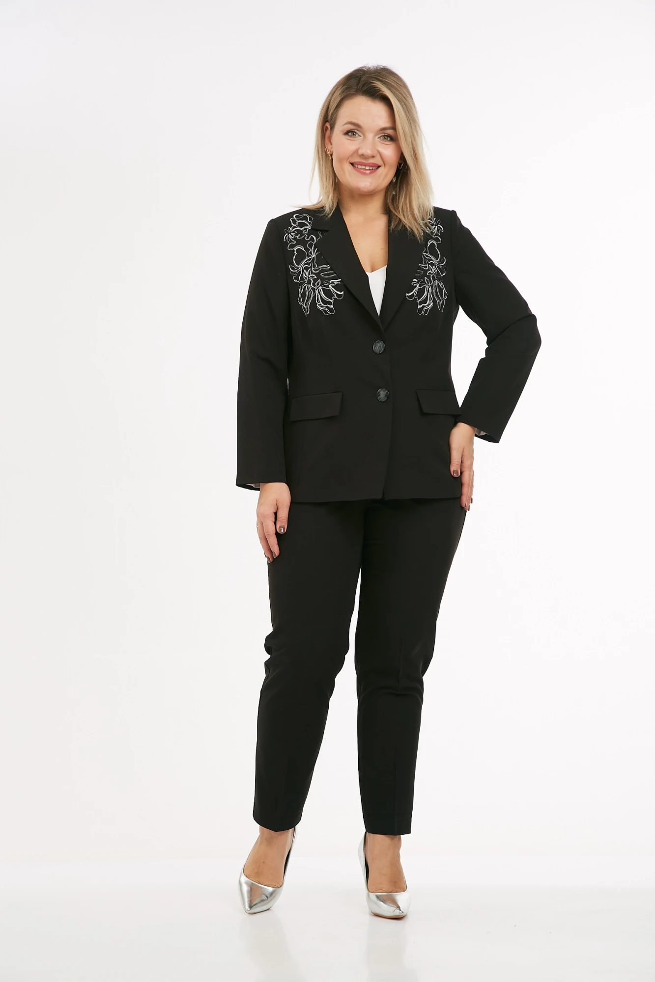 Жакет из костюмной ткани на подкладке, полуприлегающего силуэта, с отложным воротником и лацканами, с центральной бортовой застежкой на петли и пуговицы. Перед с талиевыми вытачками, прорезными карманами с клапаном и вышивкой в области груди. Спинка со средним и рельефными швами. Рукав втачной двухшовный. Воротник отложной пиджачного типа.
