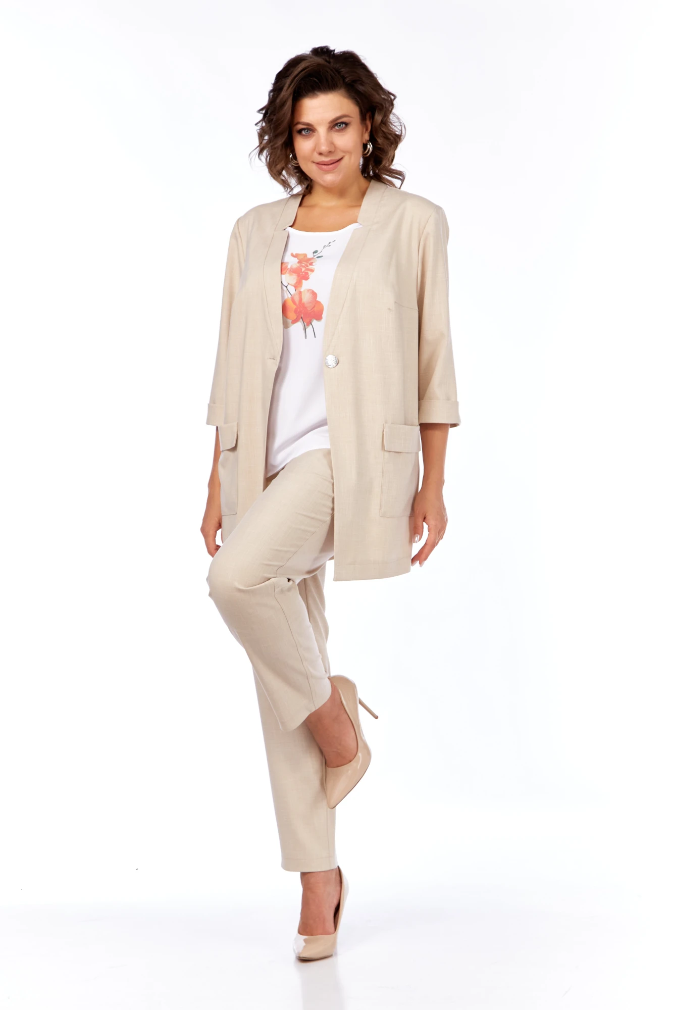 Жакет и брюки из стрейчевой костюмно-плательной ткани, имитирующей фактуру льна.