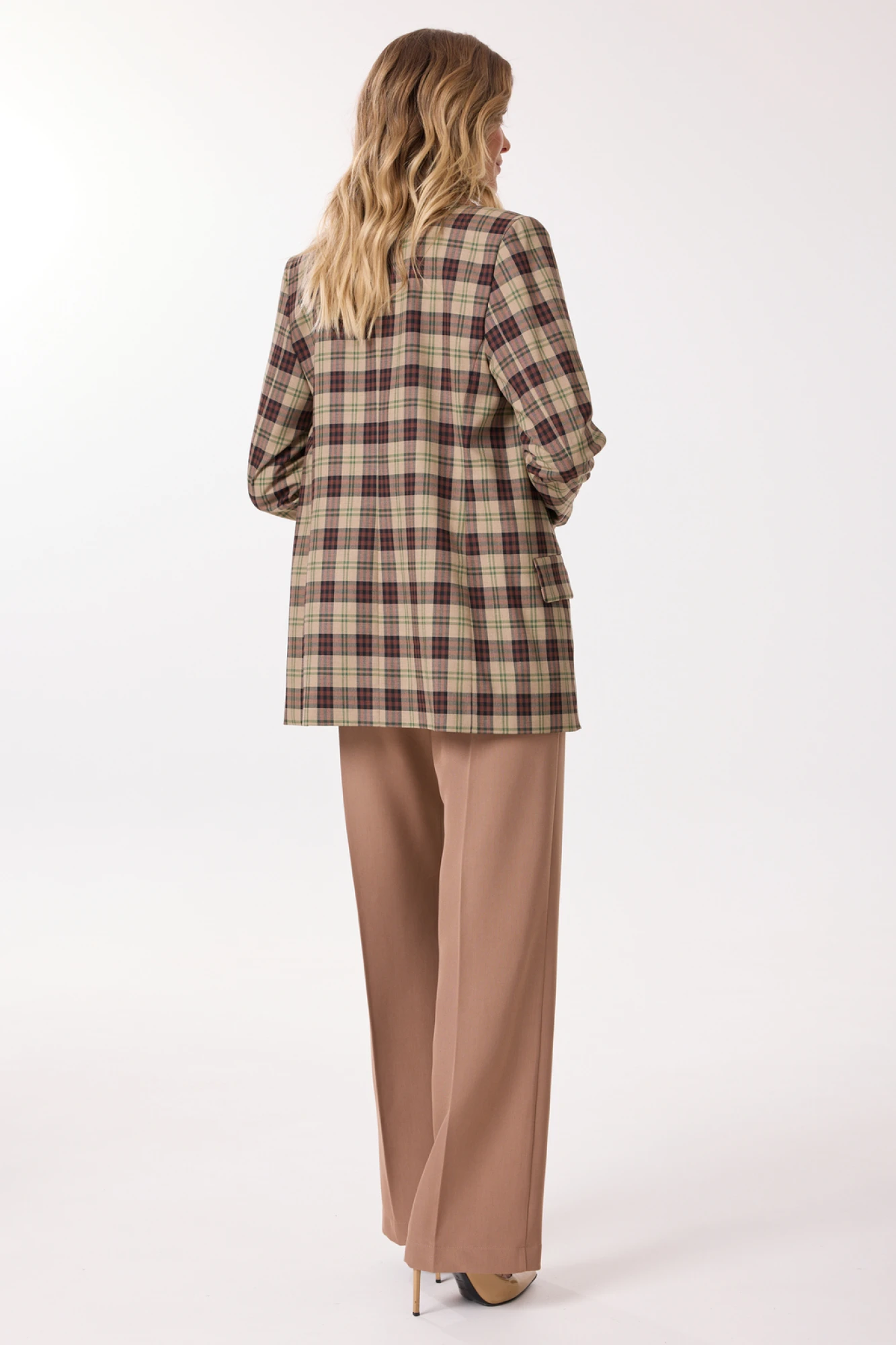 Костюм женский 3-х предметный, состоящий из жакета, брюк и джемпера. Жакет выполнен из поливискозы с принтом "клетка". Жакет полуприлегающего силуэта, на подкладке, с двухбортной застежкой на петли и пуговицы. Горловина жакета оформлена воротником пиджачного типа. Воротник выполнен из отделочной ткани-компаньена. Рукава двухшовные длинные с возможностью подворота длины. Перед с нагрудными выточками, выходящими из рельефов. В области бедер обработаны прорезные карманы "в рамку" с клапаном. Спинка со средним швом и рельефами. Брюки прямого силуэта со стрелками по передним и задним половинкам. Выполнены из однотонной поливискозы. Верхний срез обработан притачным поясом. По центру переда - застёжка на крючок и тесьму-молнию. На задних половинках расположены талиевые вытачки и декоративные листочки. В боковых швах расположены наклонные карманы. Джемпер прямого силуэта, выполнен из 100% вискозы. Перед и спинка цельнокроенная. Рукав длинный. Горловина типа "водолазка". Длина изделия - середина бедра.