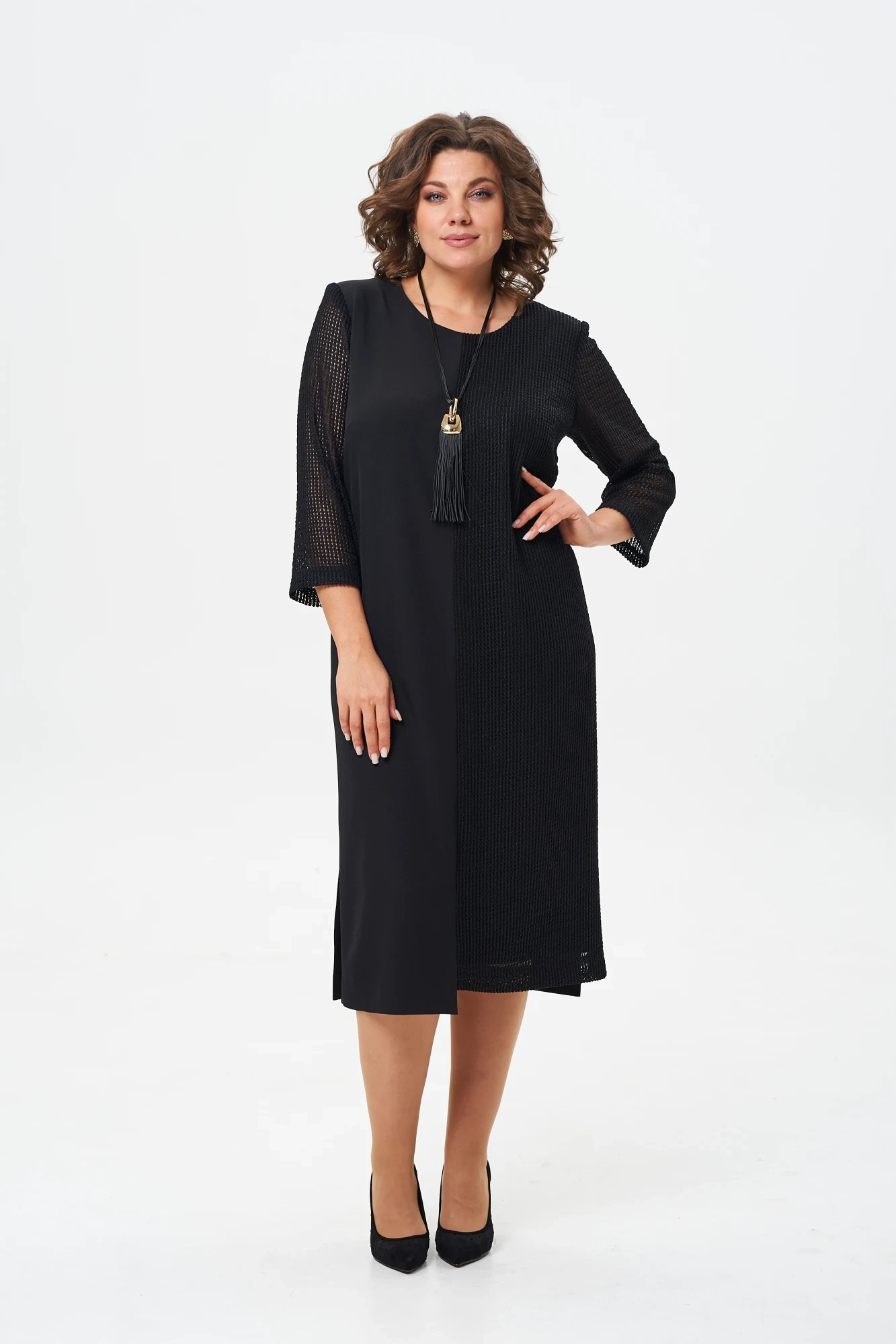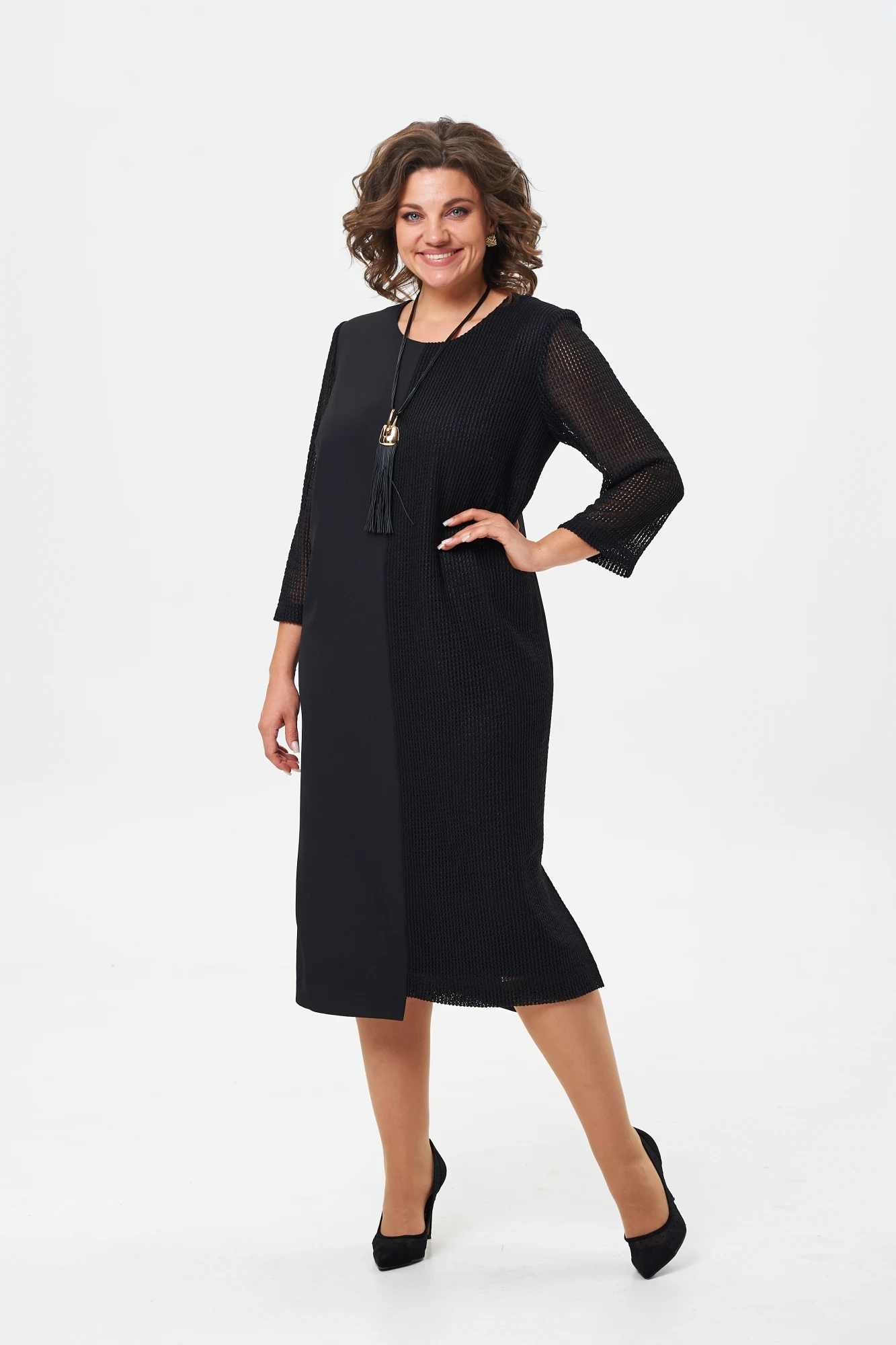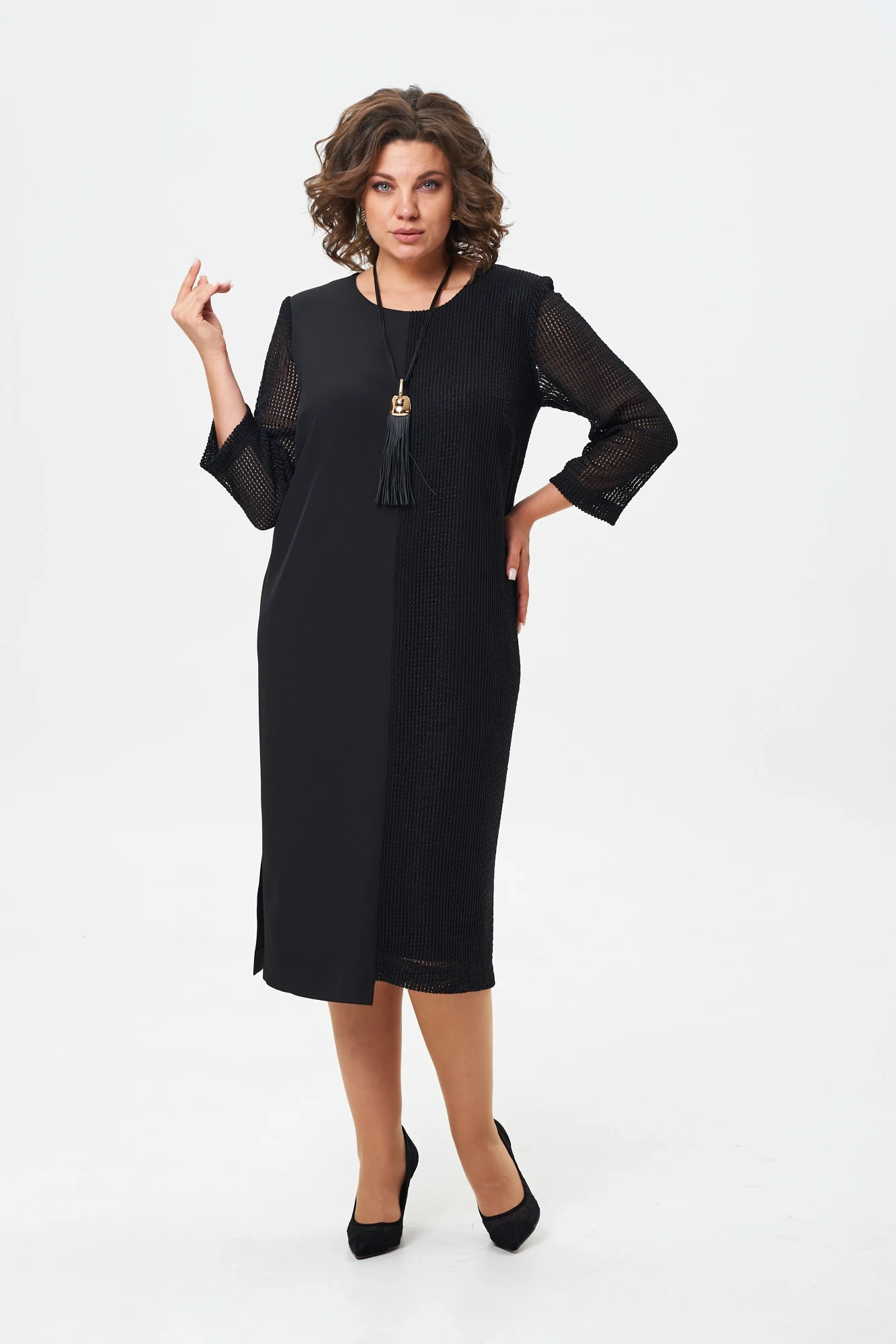 Платье женское, комбинированное из двух видов ткани. Перед с нагрудной вытачкой, выходящей из линии проймы, с разрезами сбоку и центральным швом. Спинка со средним швом, в котором обработана потайная молния. Горловина овальная. Рукав втачной одношовный длиной 7/8. Левая часть переда и рукавов изготовлены из сетки. Низ изделия ассиметричной формы.