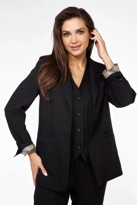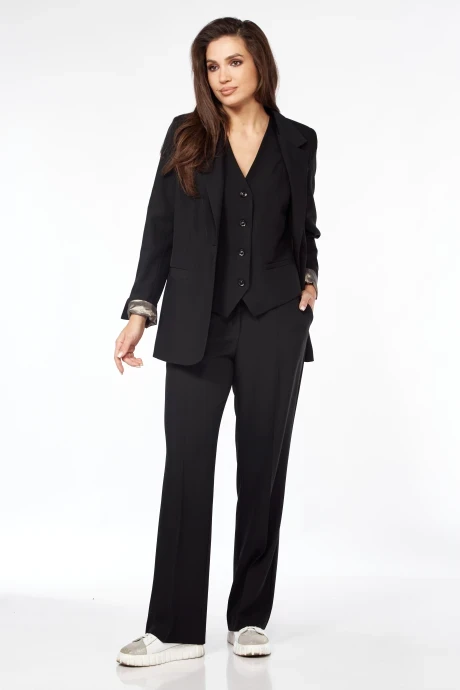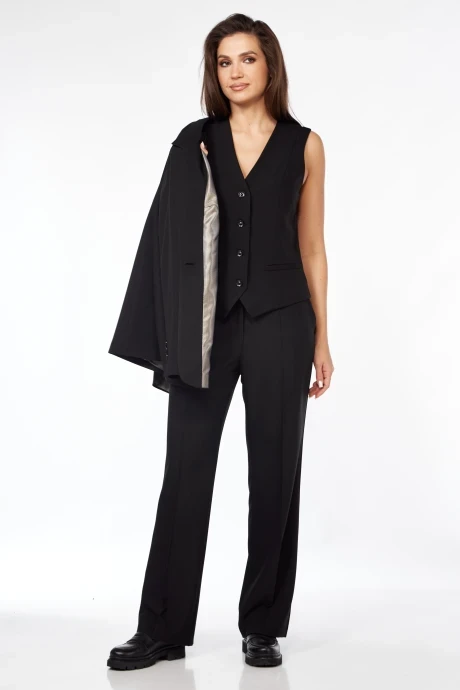 Костюм женский 3-х предметный, полуприлегающего силуэта. Состоит из жакета и жилета на подкладке и брюк. Жакет с воротником пиджачного типа, центральной застёжкой на 1 петлю и 1 пуговицу. Перед с рельефными швами от пройм до низа и талиевыми вытачками и прорезными карманами с листочками с втачными концами. Спинка со средним швом. Рукав втачной, двухшовный, длинный со шлицей. Жилет с рельефными швами от пройм до низа по переду и спинке, с центральной застёжкой на 4 петли и 4 пуговицы. Перед с прорезными карманами с листочками с втачными концами. Брюки с застёжкой на тесьму "молнию" в средних срезах передних половинок, с притачным поясом на 1 петлю и 1 пуговицу и резинкой по задним половинкам, с карманами наклонными к боковым швам. По передним и задним половинкам заутюженные канты.