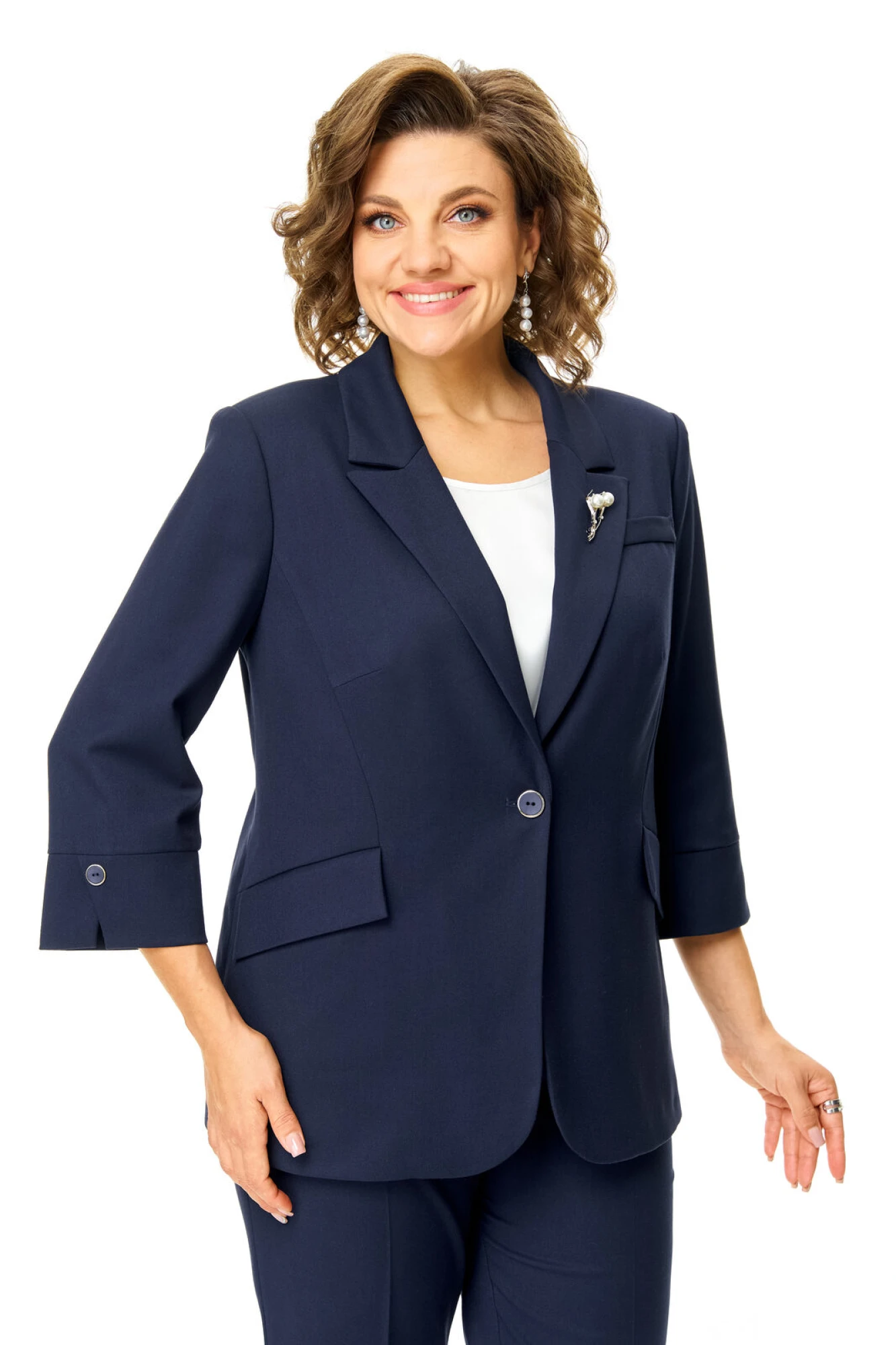 Костюм женский состоит из жакета и брюк.Жакет полуприлегающего покроя с естественной линией плеча на подкладке.Застежка однобортная на петлю-пуговицу.Спинка со средним швом и талиевыми вытачками.Перед с рельефами из проймы и небольшой нагрудной вытачкой.По переду, в подрезах, обработаны карманы с клапаном.Низ борта округлой формы.Воротник пиджачного типа.Рукав длиной 3/4 с авторской манжетой по низу.Брюки зауженные к низу, с центральной застёжкой на молнию и петлю-пуговицу.В боковых швах карманы с отрезным бочком.Пояс притачной с резинкой по бокам.В комплект входит съёмная металлическая брошь.