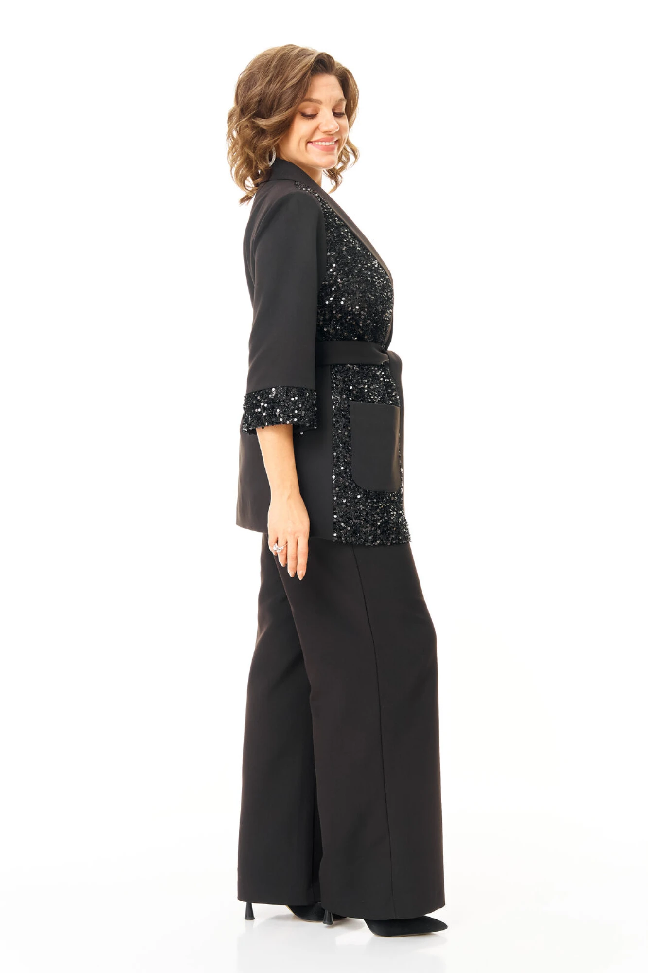Комплект женский состоит из жакета, топа и брюк. Жакет свободного покроя с естественной линией плеча.Рукав втачной одношовный длиной 3/4 с манжетой из отделочной ткани "пайетки".Перед выполнен из отделочной ткани "пайетки" на атласной подкладке.Обработаны отрезные планки.Застежка центрально-бортовая на петли пуговицы.Воротник отложной типа "шаль".На переде выполнены накладные карманы.Топ свободного покроя из атласной ткани.Горловина округлой формы.Брюки расширенные к низу типа "палаццо" с центральной застёжкой на молнию и петлю-пуговицу.В боковых швах карманы с отрезным бочком.Пояс притачной с резинкой по задней части пояса.В комплект входит съёмный пояс.
