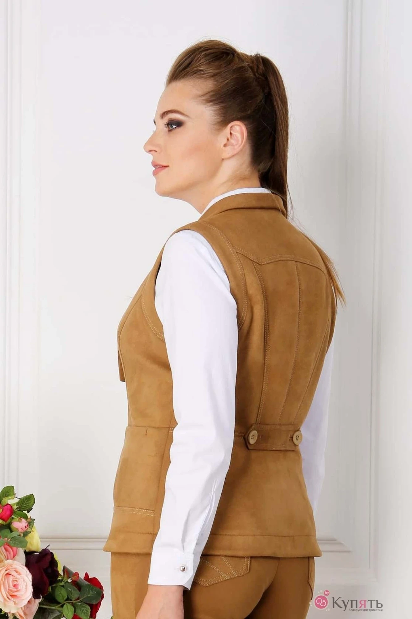 Костюм состоит из жилета и брюк. Жилет прилегающего силуэта без подкладки, отрезной по линии талии, с воротником типа «апаш» с центральной бортовой застежкой на пуговицы. Лиф переда с отрезными бочками и входом в карман по линии талии. Лиф спинки с притачной фигурной кокеткой, отрезными бочками, средним швом и хлястиком, расположенным на линии талии. Проймы обработаны обтачками. Срезы обтачек окантованы. Брюки зауженные к низу на поясе с застежкой на 2 пуговицы и гульфиком с застежкой «молнией». На задних половинках расположены карманы. По боковым швам фигурные подрезы, переходящие на пояс. Срезы обтачек окантованы.
