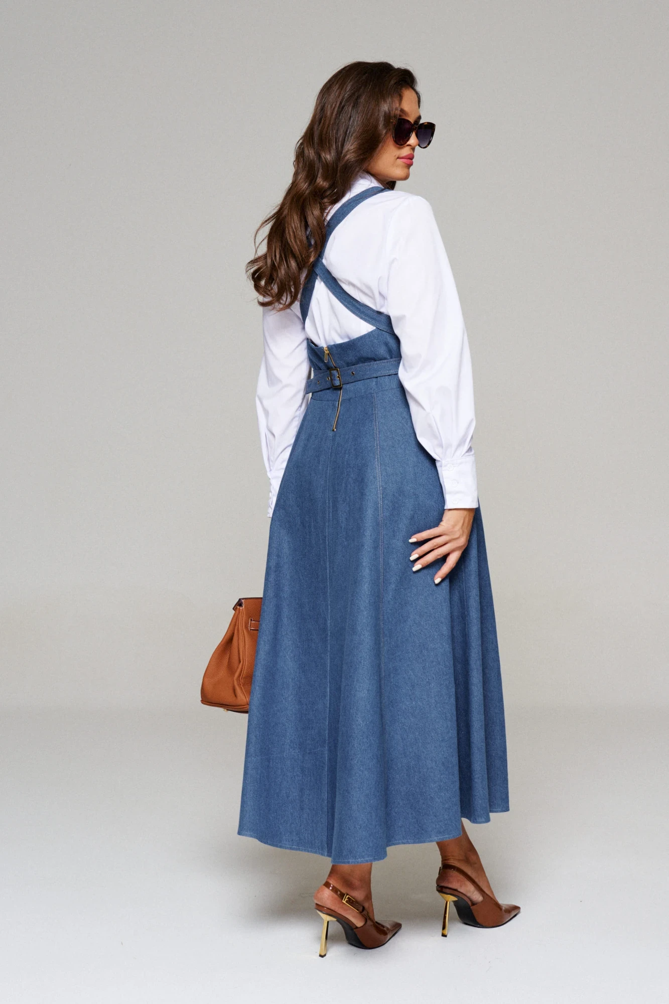 Сарафан приталенного силуэта, выполнен из джинсовой ткани; отрезной по линии талии.