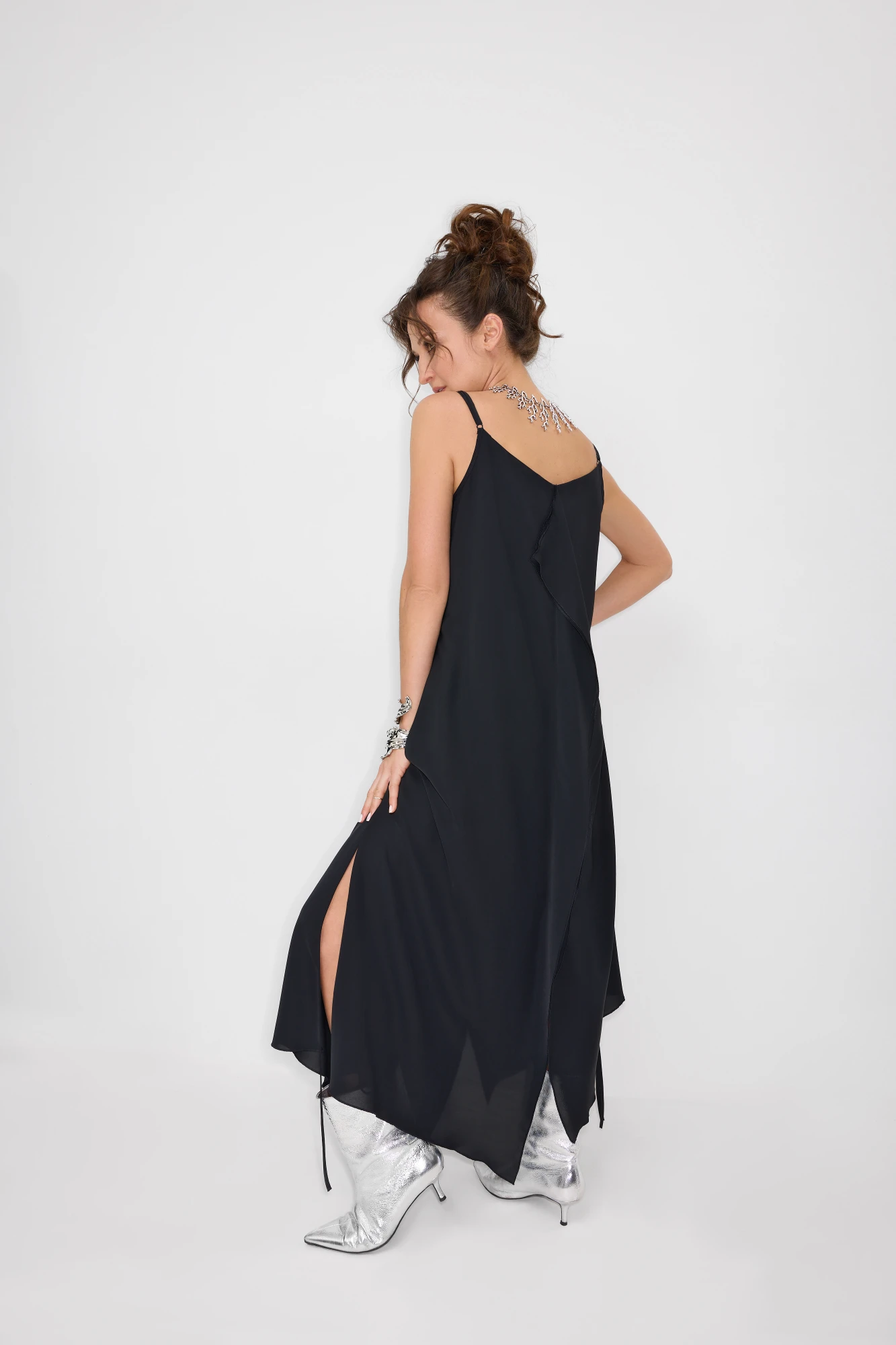 Комплект женский, состоящий из платья и шазюбля. Платье А-образного силуэта, на подкладке. По переду и спинке средний шов, переходящий в волан и разрез. В боковых швах карманы и окантованные разрезы со шнурками. Низ разноуровневый, фигурный. Бретели регулируется, что позволяет посадить платье на разный рост. Шазюбль прямого силуэта. Состоит из двух видов ткани. Застежка на петли и пуговицы на планке. Воротник рубашечного типа. Рукав втачной, заканчивается манжетой с завязками. По спинке кокетка. Нижняя часть спинки выполнена из гипюра. В боковых швах высокие разрезы и хлястики, которые помогают регулировать прилегание.