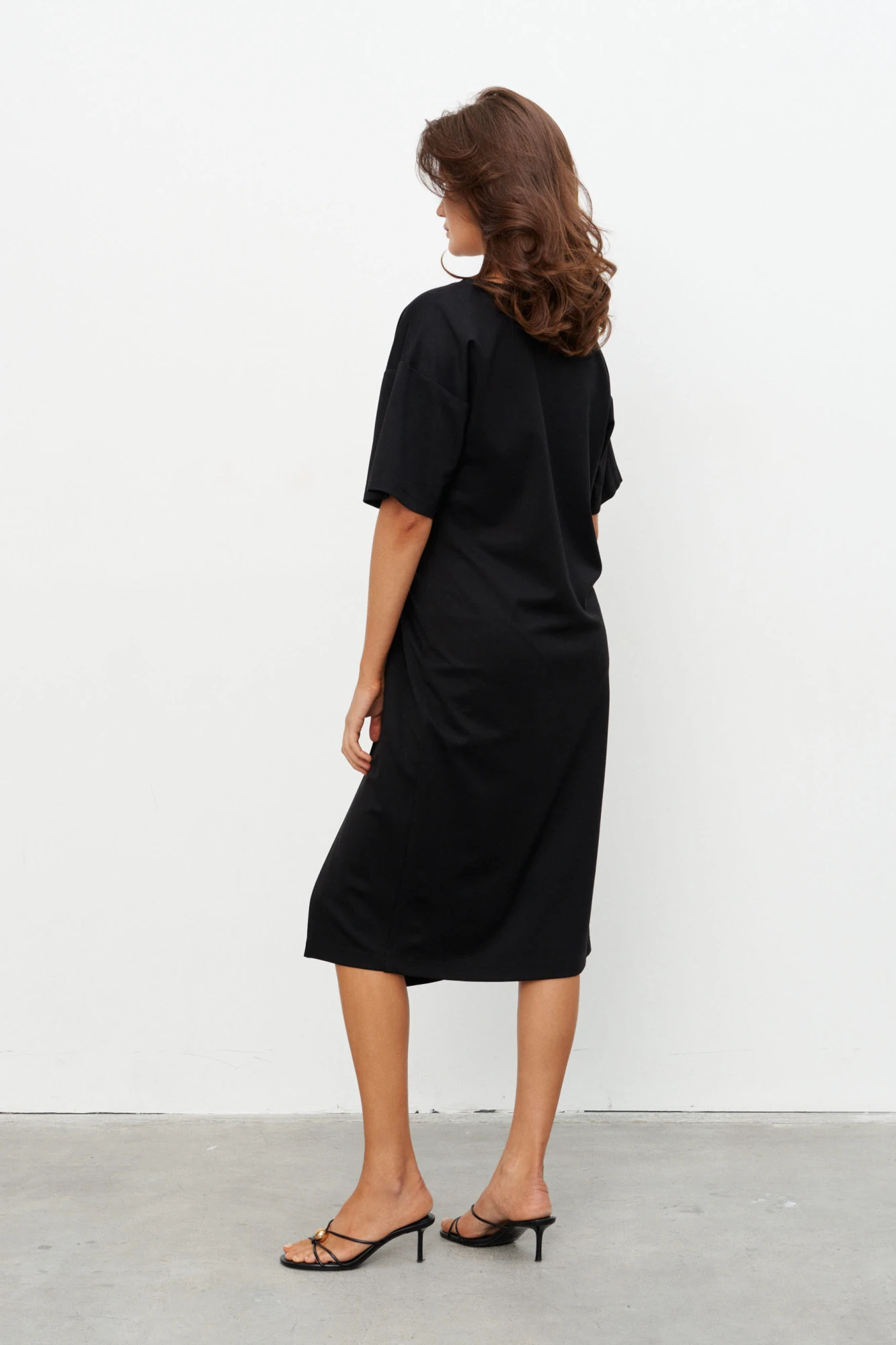 Комплект из трикотажного полотна состоящий из платья-туники и шорт. Платье со спущенным плечом и рукавом до локтя, горловина отделана эластичной бейкой. Сбоку, чуть ниже талии, конструктивный элемент в виде узла, переходящего в высокий разрез. Через узел протянуто декоративное золотое кольцо. Шорты плотно прилегающие на резинке по поясу.