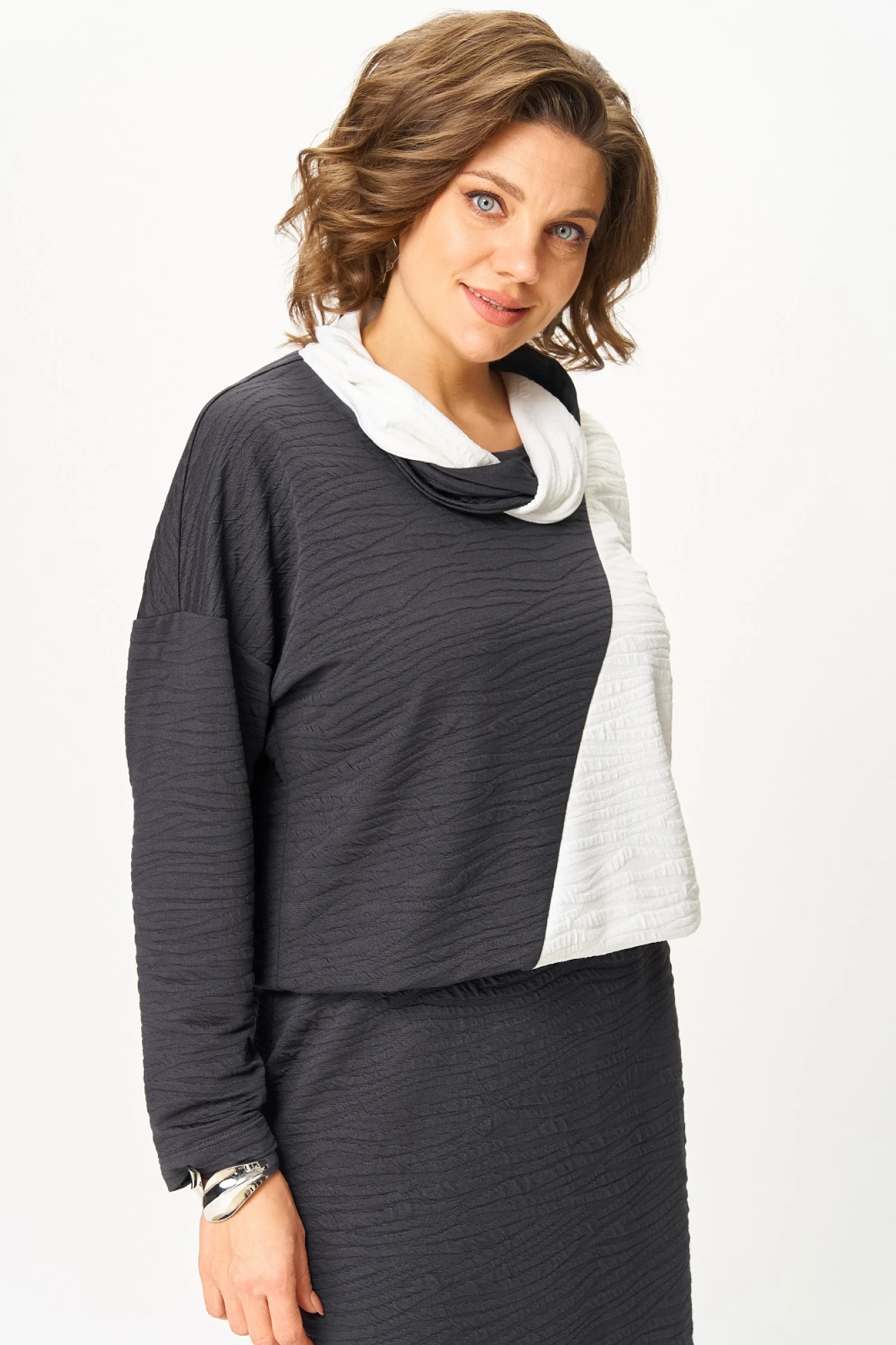 Нарядное женское платье из трикотажной ткани с добавлением вискозы. Оригинальность платью придает слегка выпуклая фактура рисунк ткани и сочетание контрастных цветов. Силуэт прямой, удлиненное, вырез горловины круглый с отлетным по переду воротником - хомутом. Эффект воротника в переплетении двух цветов. Линия плеча слегка опущена, рукав длинный. Лиф и юбка соеденины отрезным поясом с резинкой, что позволяет делать напуск лифа. Юбка платья с разрезом по спинке, на подкладке.