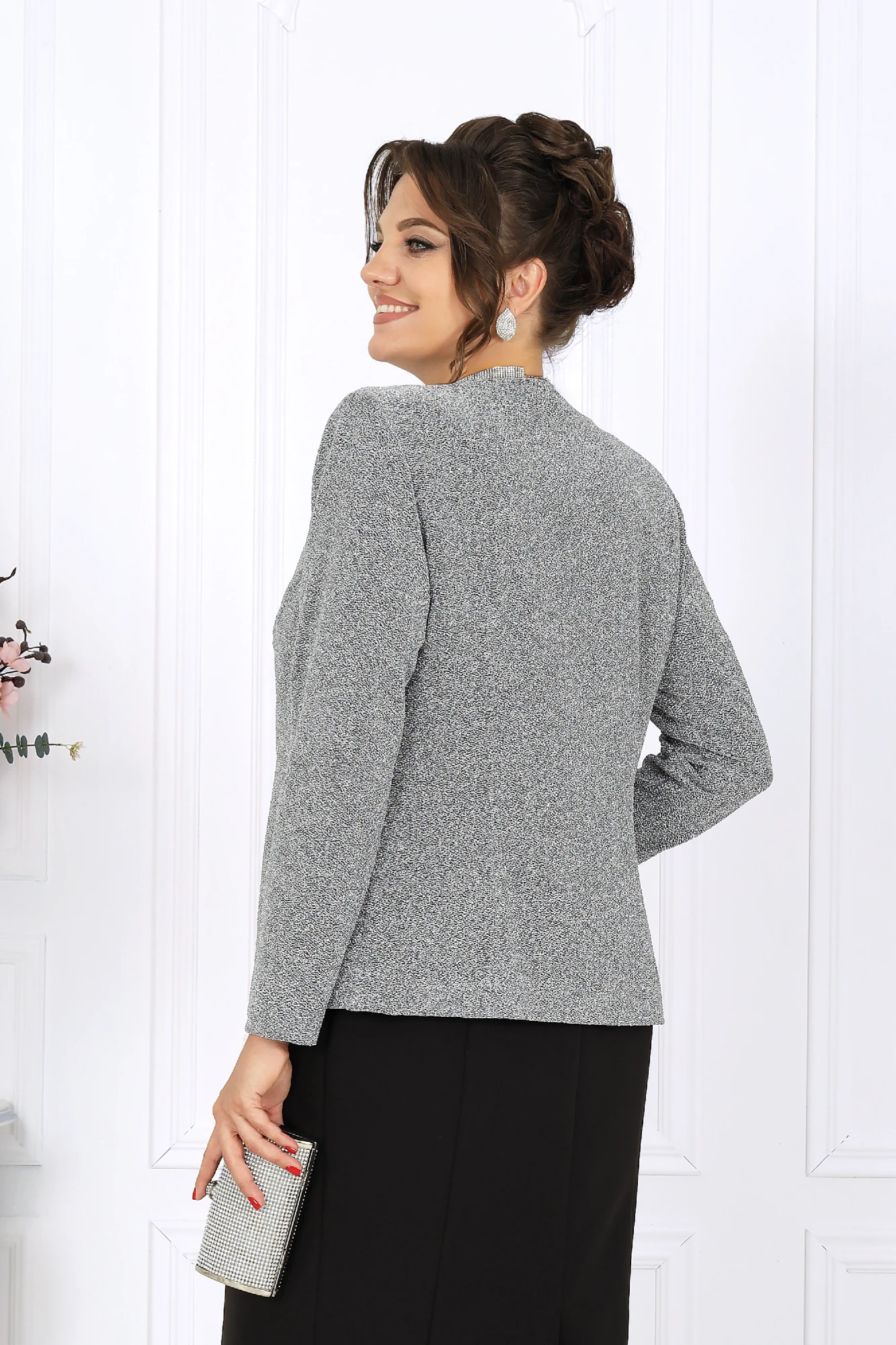 Жакет выполнен из трикотажного полотна с благородным мерцанием люрекса - лёгкое свечение ткани придаёт образу торжественность и статусность. Фигурный крой бортов с асимметричной застёжкой визуально вытягивает силуэт, делая талию более выразительной. Подкладка и аккуратные плечевые накладки формируют чёткий, «дорогой» контур, характерный для премиальных моделей.