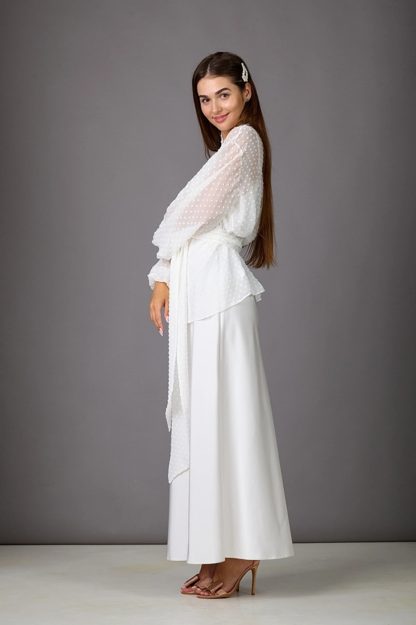 Комплект женский, состоящий из блузы и платья. Прозрачная блуза из шифона немного расширена к низу, с планкой по горловине и бортам. Рукава-балон. Завязывается на пояс. Платье-комбинация из плотного атласа. Крой выполнен по косой, что обеспечит великолепную посадку на фигуре. Бретели регулируемые.