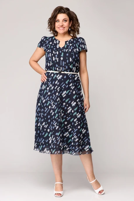 Вырез горловины круглый с V-образной " капелькой". Платье без молнии, с резинкой по линии талии и декоративным съемным поясом.