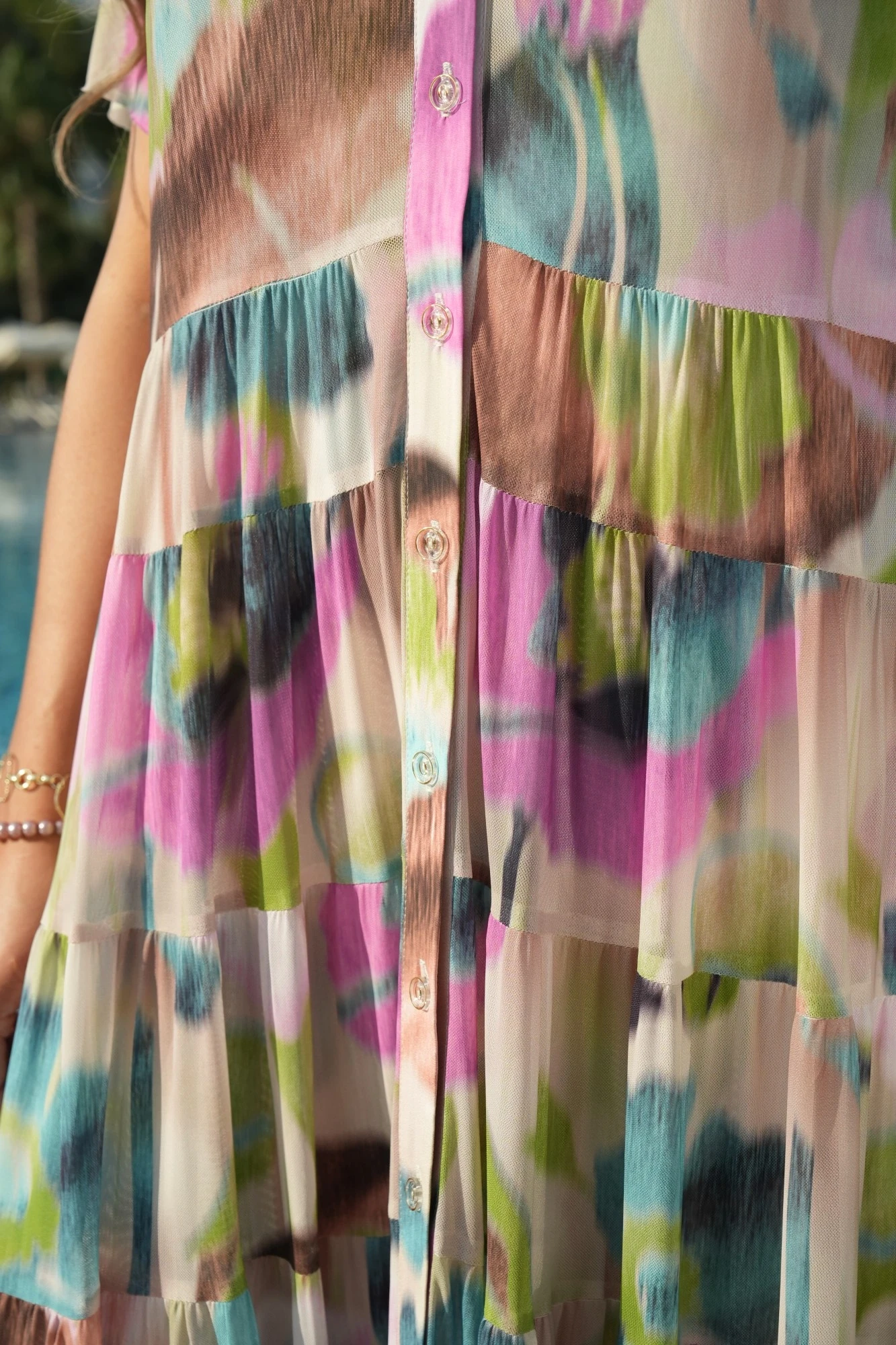 Верхнее платье свободное, трапециевидного силуэта с кокетками по переду, подрезом под грудью и воланами со сборкой. Горловина в платье с прилегающей стойкой и центральной застёжкой на планку и декоративные пуговицы. Рукав втачной, короткий. Спинка без особенностей. Нижнее платье прямого силуэта с округлой горловиной и нагрудными вытачками. Обращаем ваше внимание, что фурнитура может незначительно отличаться от фото.