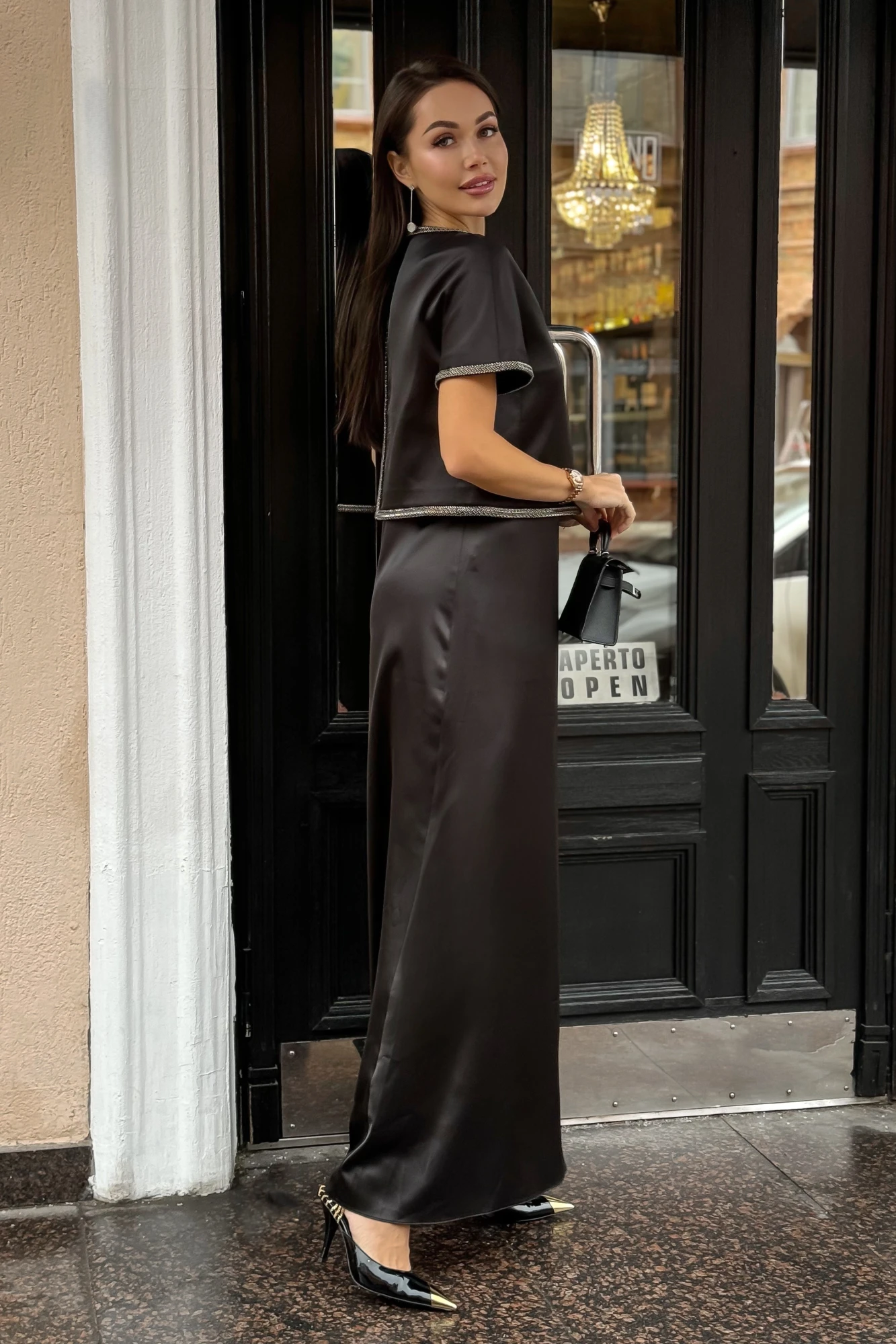 Низ переда, спинки и рукавов, горловина, застежка спинки вдоль молнии декорированы отделочной тесьмой из сетки с нашивными бусинами (размер и цвет фурнитуры может незначительно отличаться от фото).