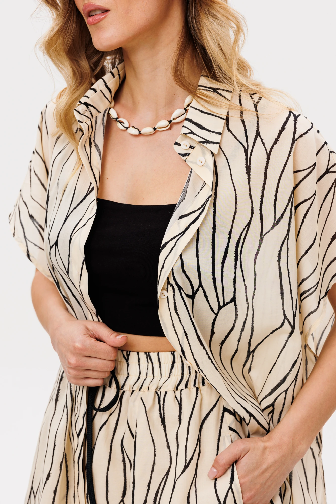 Комплект: блузка + шорты. Комплект выполнен из плательно-блузочной ткани с принтом. Блузка прямого покроя, длиной до линии бедер. Спереди застежка с планкой на пуговицы. Спинка цельная. Воротник стояче-отложной. Плечевой шов удлинен. Рукав покроя "кимоно", длиной выше линии локтя. Шорты расширены к низу, на притачном поясе с эластичной тесьмой. Спереди на боковых швах карманы. По переду пояса петли и протянут шнур. Шорты на притачной по низу подкладке. Топ в комплект не входит, его можно приобрести отдельно арт.2427.
