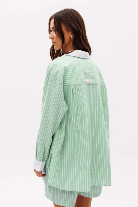 Рубашка свободного овер силуэта, рубашечного покроя с классическим рубашечным рукавом и воротником. Низ изделия разноуровневый, по боковым швам-разрезы. Полочка с центральной застежкой и накладным верхним карманом. Спинка с отрезной кокеткой и двумя мягкими складками. Рукав на притачной манжете с декоративным разрезом и мягкой складкой по линии притачивания. Манжета рукава и воротник из отделочной ткани.
