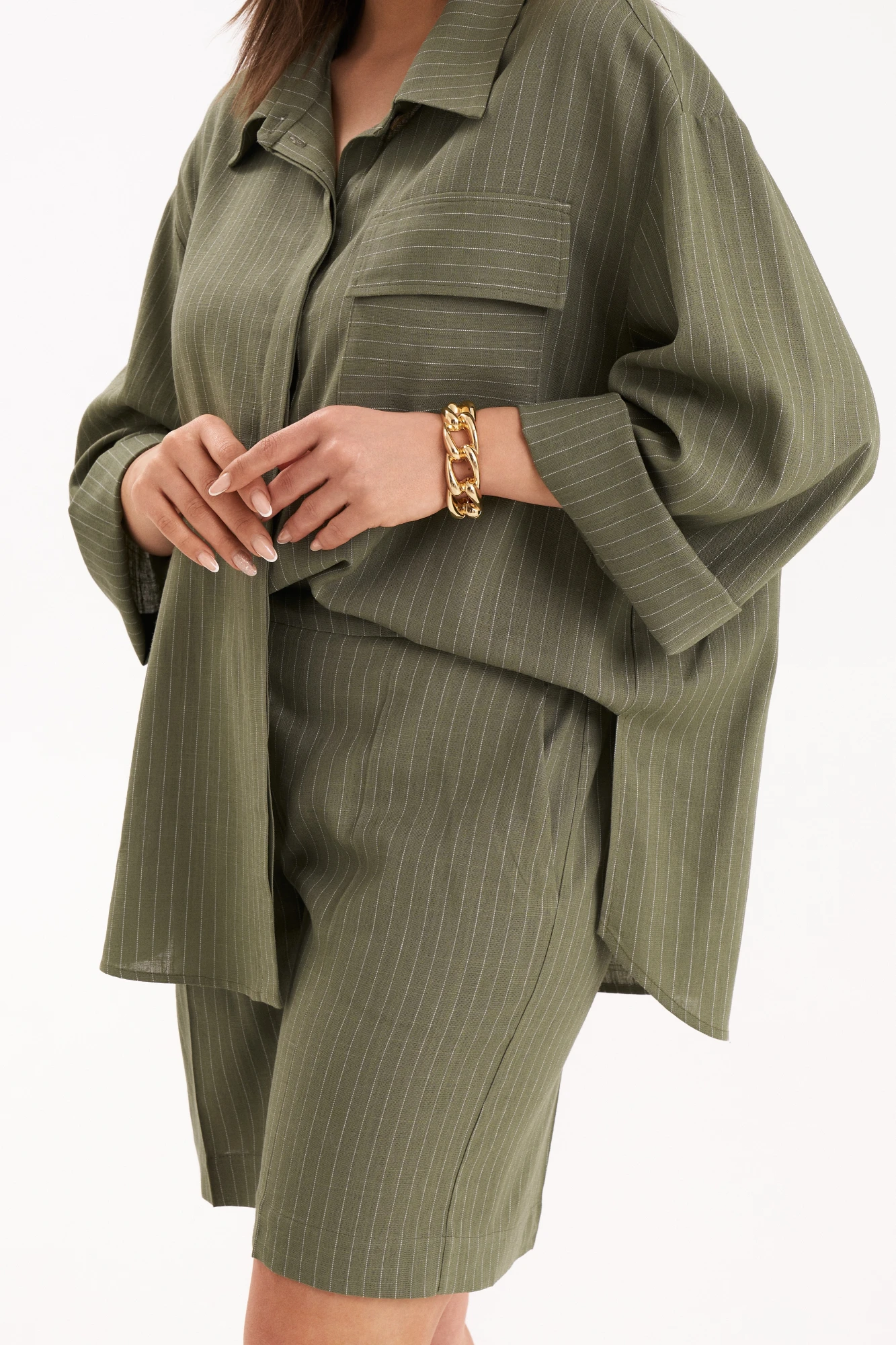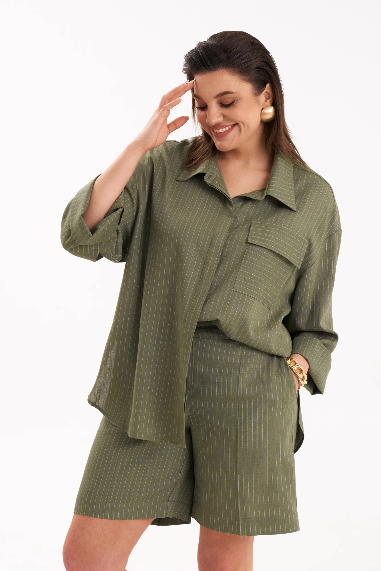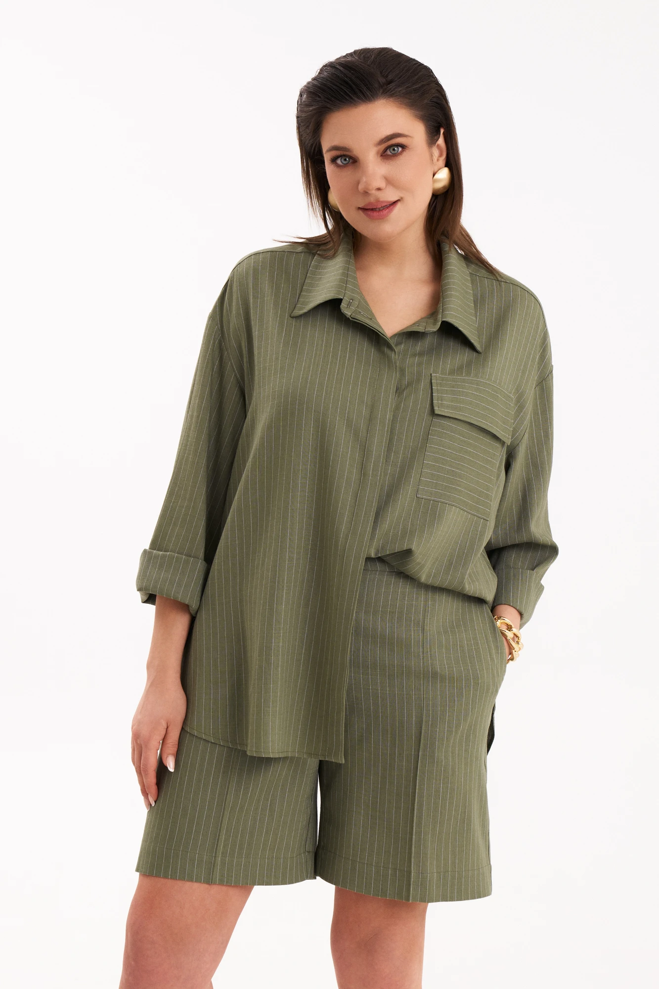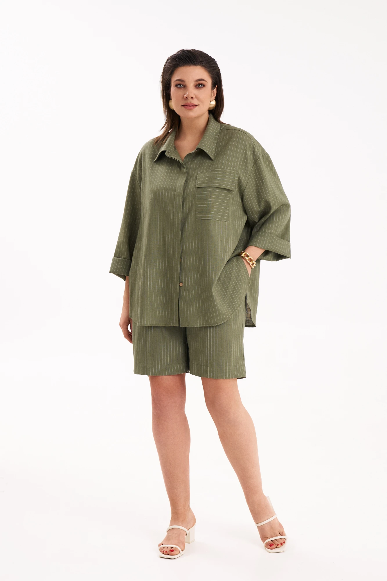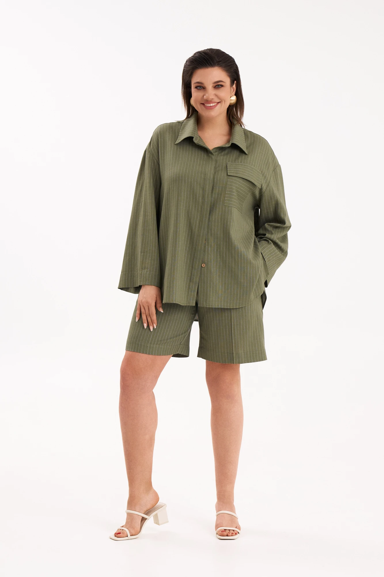 Комплект, состоящий из объёмной рубашки и шорт. Рубашка со спущенной линией плеча. Рукав длиной 7/8 с широкой подгибкой. По переду накладной карман с клапаном. Низ рубашки фигурный. По бокам разрезы. Шорты на резинке по поясу спинки. Застёжка на гульфик с молнией и пуговицу. По бокам карманы.