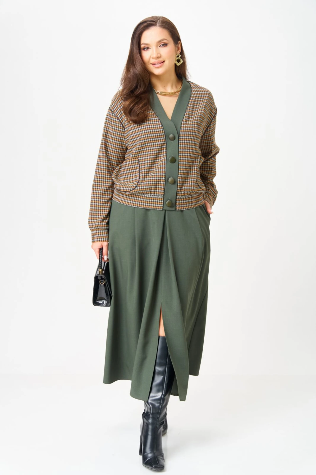 Этот костюм — воплощение интеллектуальной элегантности. Мягкий светло-серый кардиган с коричневыми кантами и крупными пуговицами создаёт образ уютного шарма. V-образный вырез визуально вытягивает шею, а контрастные детали подчёркивают чёткость линий. Рукав на спущенной плойме с манжетой по низу. По перду накладные карманы с декоративной нашивкой. Коричневая юбка миди с глубокими встречными складками и разрезом по переду добавляет образу женственности. В боковых швах карманы. Юбка на подкладке. Для максимально комфортной посадки по бокам пояса вставлена эластичная резинка. Сочетание мягкого верха и строгого низа создаёт баланс между комфортом и аккуратностью, делая комплект универсальным для офиса, повседневных выходов и стильных деловых встреч.