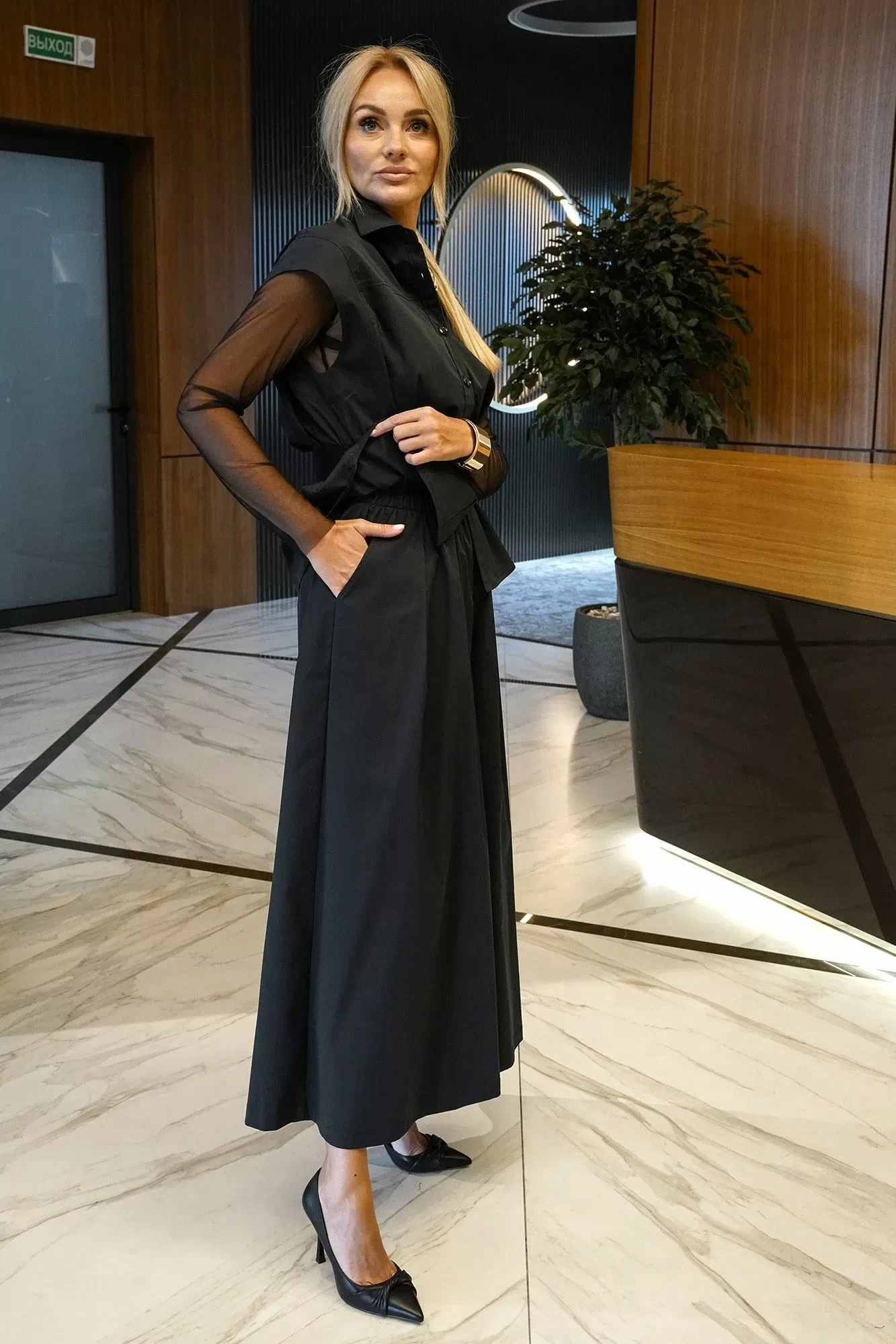 Юбка-Брюки широкие свободного силуэта, с притачным поясом на резинке. Передние части с мягкими складками от пояса и косыми боковыми карманами.
