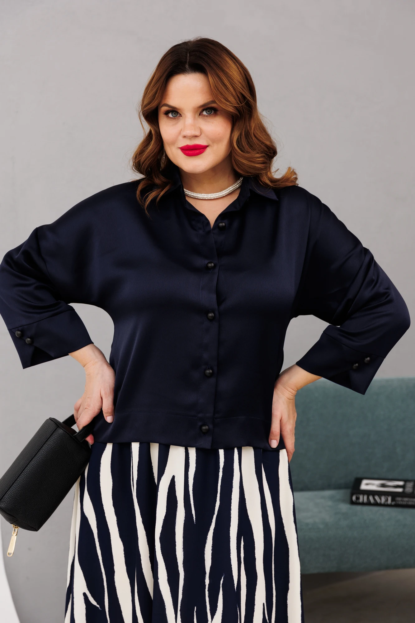 Комплект женский 2-х предметный (блузка, юбка). Отлично подойдет на любой тип фигуры, подчеркнет вашу женственность. Блузка из атласной ткани прямого силуэта со спущенным плечом. Застежка- планка на петли и пуговицы. Воротник на отрезной стойке. Рукав одношовный, втачной, 3/4 длины с манжетой. В качестве декора- по манжете пуговицы, по низу блузки широкая подгибка с отстрочкой. Юбка расширенная к низу на подкладке. Пояс на резинке.