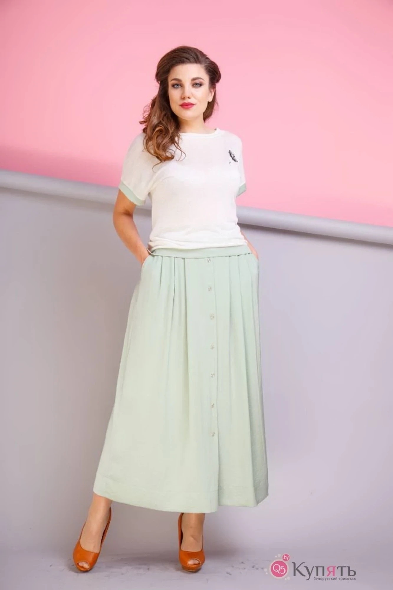 Комплект женский 2-х предметный (блуза, юбка) из двух видов ткани. Блуза из трикотажного полотна, юбка из текстильной ткани. Блуза прямого силуэта. Полочка и спинка цельные, со спущенным плечевым швом. Горловина переда овальной формы, по спинке V-образной формы. В горловину блузы втачана бейка. По низу спущенной проймы вставлена манжета из ткани юбки. По низу блузы вставлен пояс: узкий по переду, немного шире по спинке. На блузке съемное украшение. Юбка двухшовная, на подкладке. На передней части по центру - складка с пришитыми 7 пуговицами. По боковым швам переда карманы. По переду и спинке юбки, в области пояса мягкие, односторонние складки на задней части юбки - средний шов, в верху молния. Пояс юбки с резинкой по боковым швам. Застежка на 1 петлю и 1 пуговицу на поясе задней части юбки.