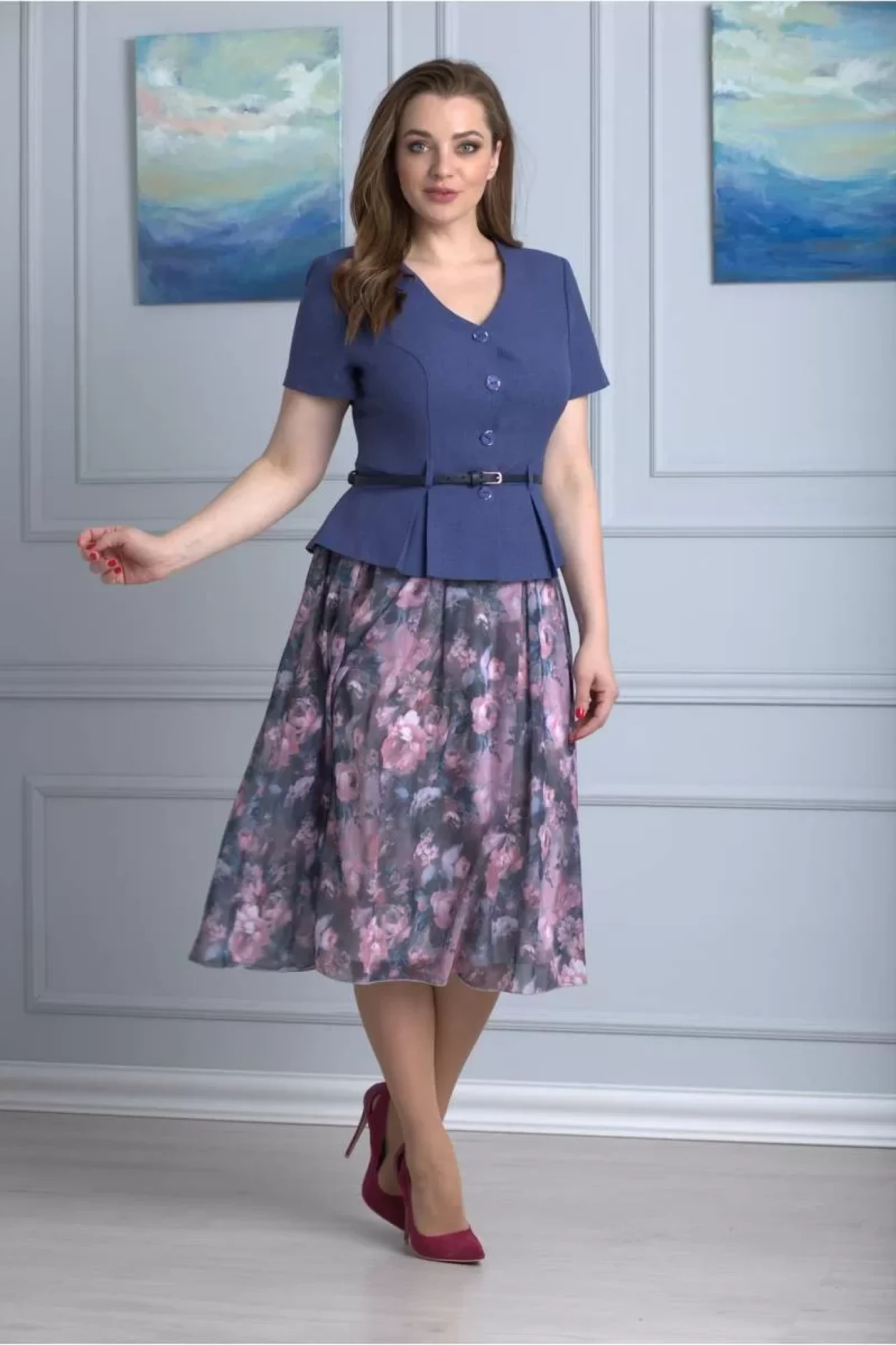Категория: Костюм жакет и юбка. Жакет с баской без подкладки. застежка пуговицы по переду, комплектуется сьемным ремнем. Юбка на подкладке, застежка скрытая молния и пуговица в боковом шве. Силуэт: прилегающий. Статус: Нарядное, нарядно-повседневное.