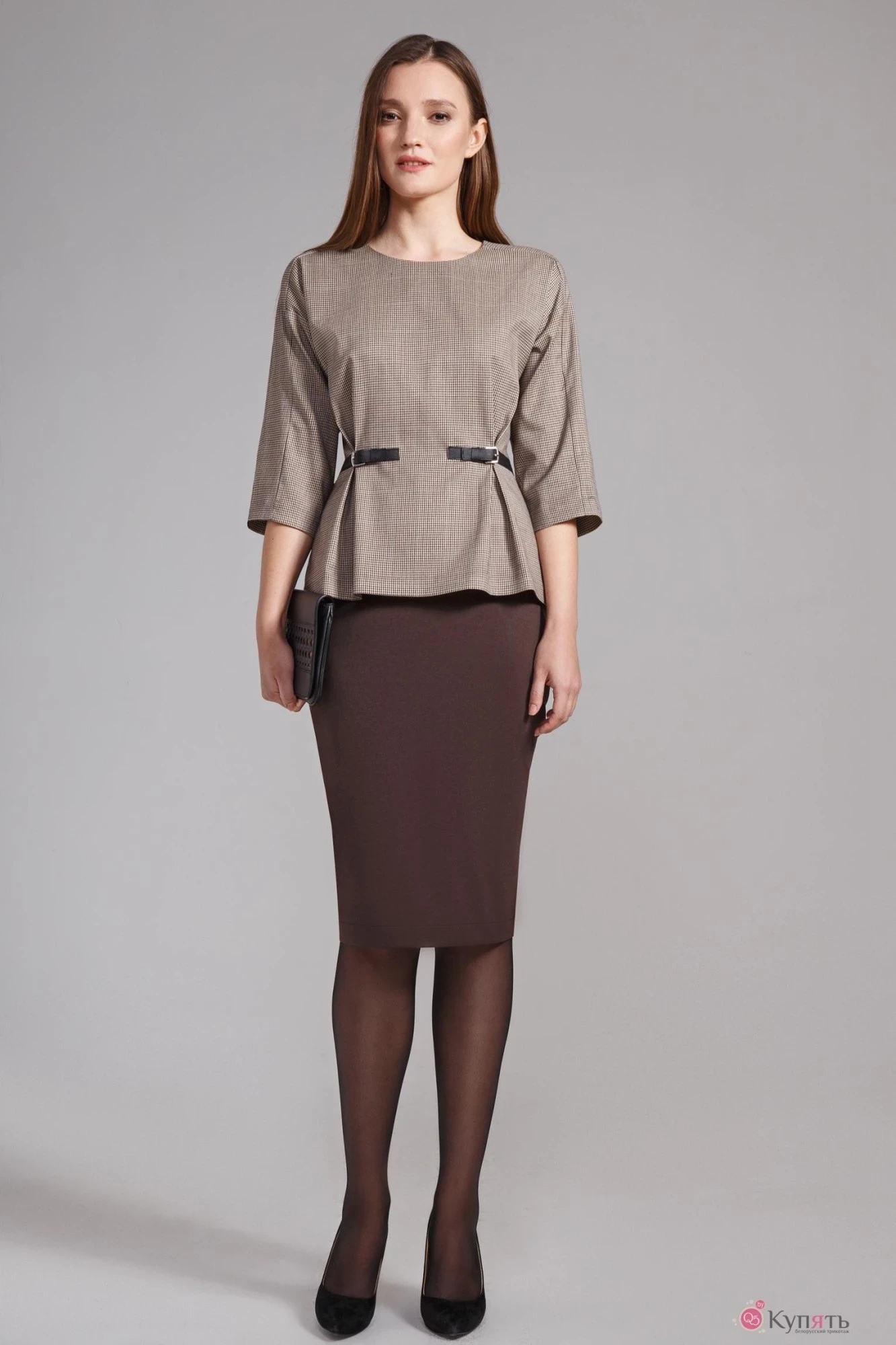 Костюм, состоящий из блузы и юбки. Блуза из текстильного полотна полуприталенного силуэта с круглым вырезом горловины, рукавами длиной ниже локтя, пряжками и застежкой на потайную молнию 55 см. Юбка-карандаш из трикотажного полотна на подкладке со шлицей сзади и застежкой на потайную молнию 18 см.