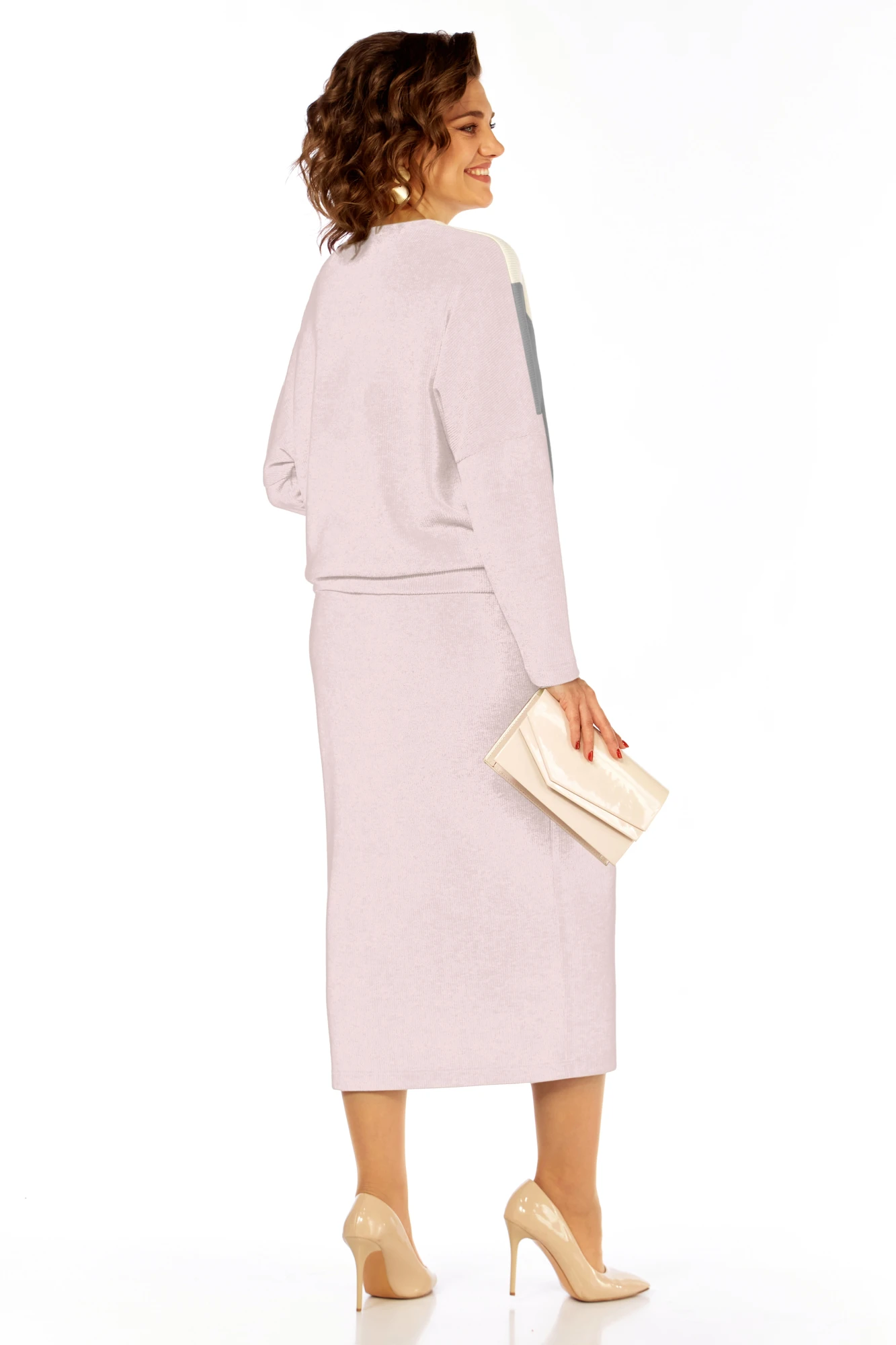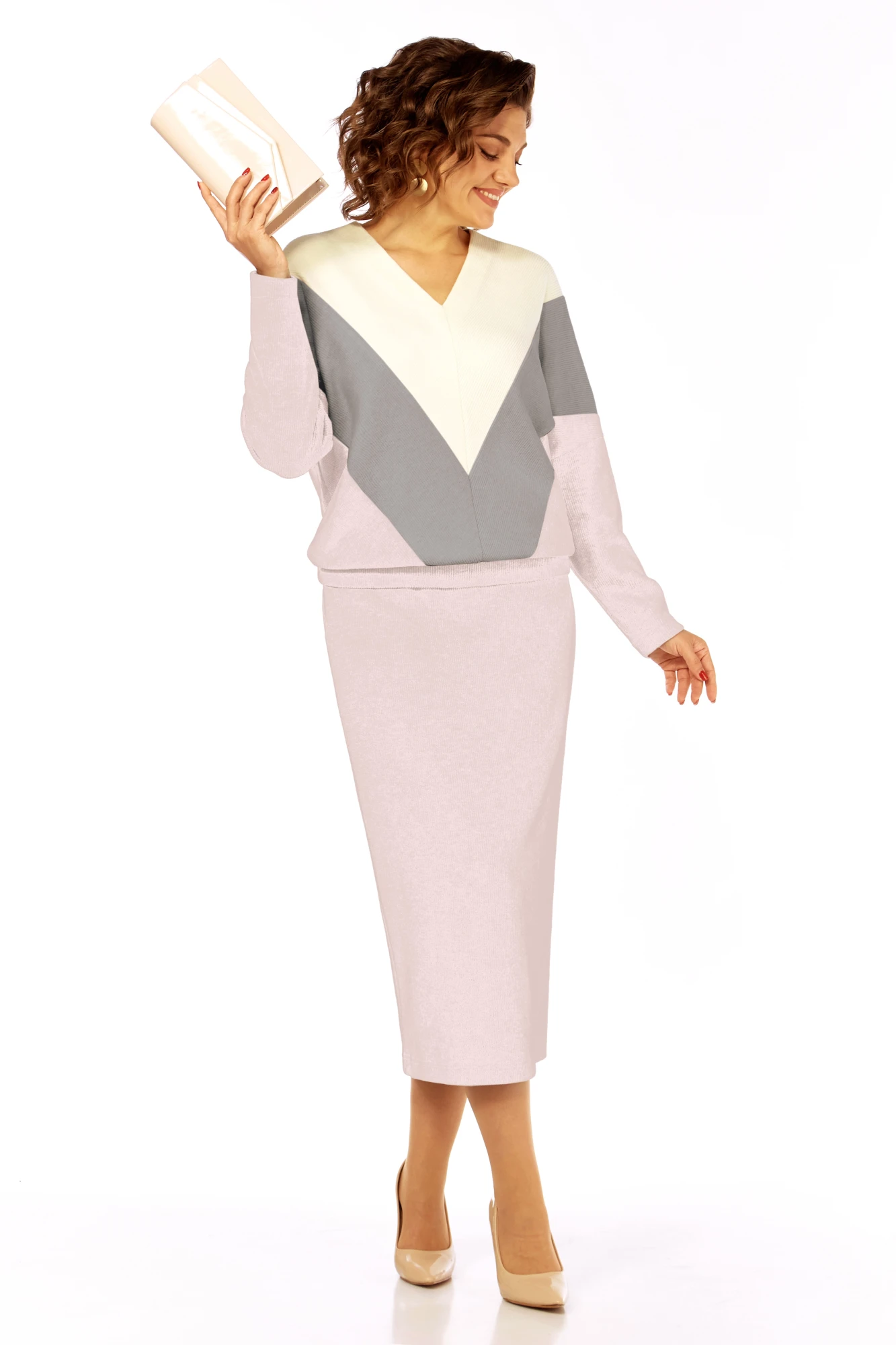 Костюм женский двухпредметный состоит из свободного джемпера и длиной юбки,выполнен из трикотажного полотна под вельвет в мелкий рубчик 3 цветов.