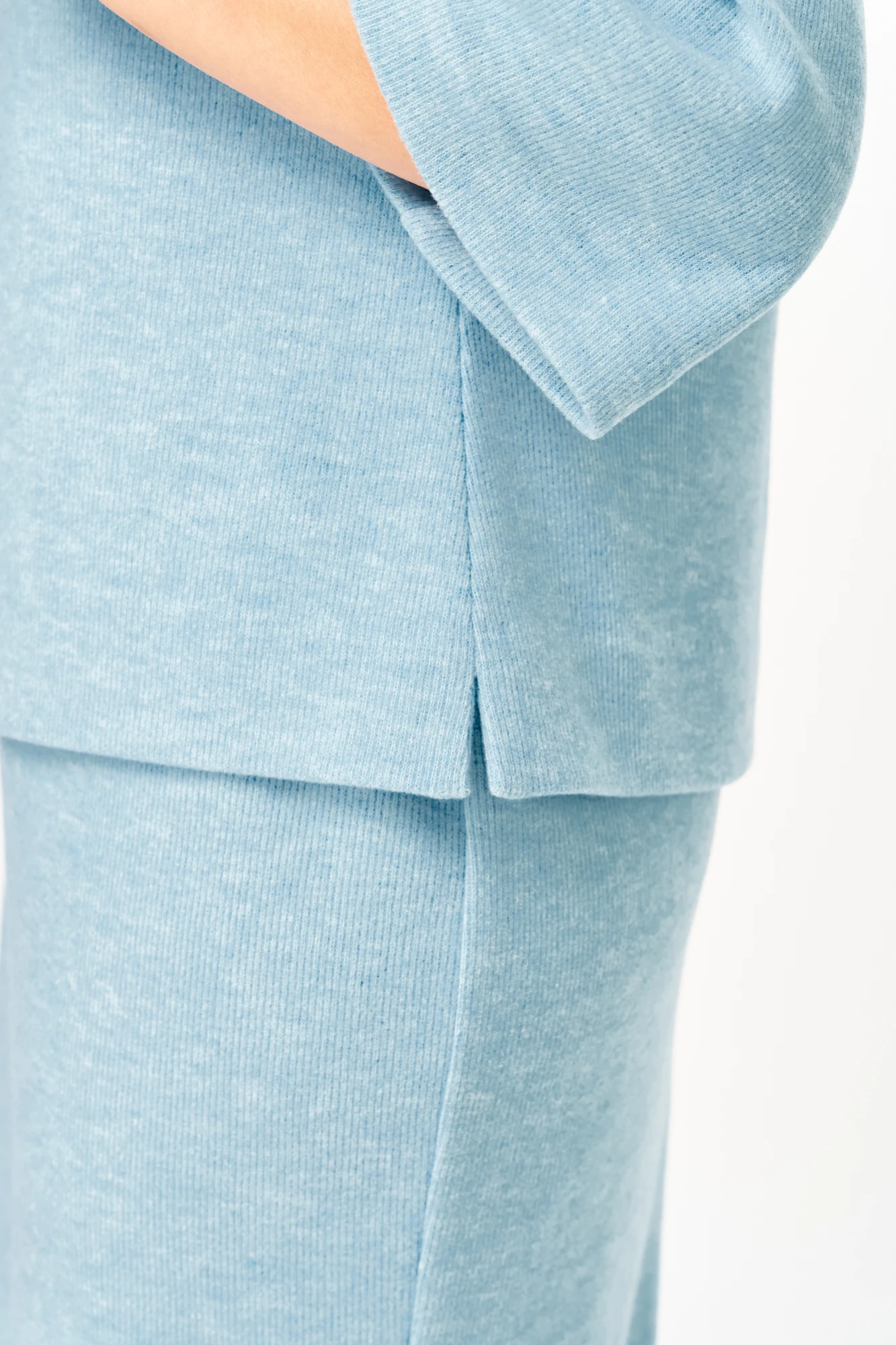 Юбка прямая, по низу шлица, верх юбки оформлен поясом на резинке.