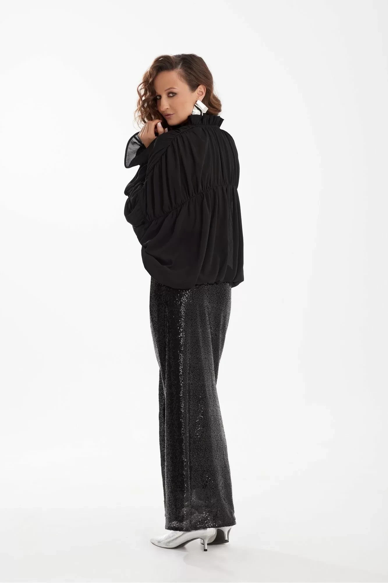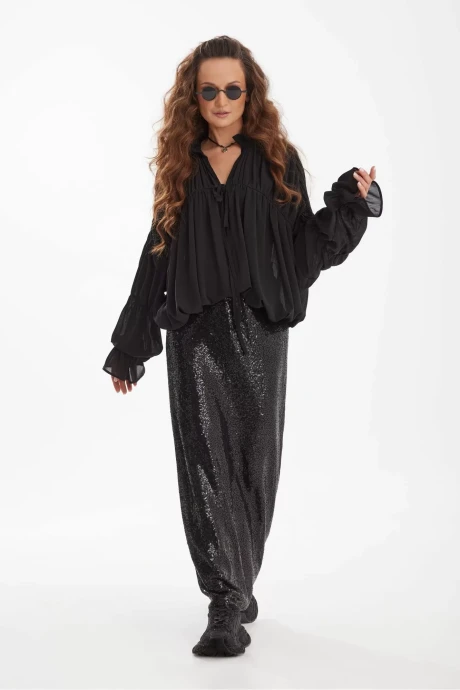 Комплект женский, состоящий из блузы и юбки. Блуза прямого силуэта. Вырез горловины V-образный, с завязками на уровне кокеток. Воротника стойка в виде рюши. Перед и спинка с кокетками. По низу кулиса со шнуром, что позволяет формировать силуэт. Линия плеча спущенная. Рукав втачной. Верх рукава со сборкой и двумя рядами резинки. Юбка прямого силуэта, расширенная к низу, на подкладке. Пояс цельнокроеный с резинкой.