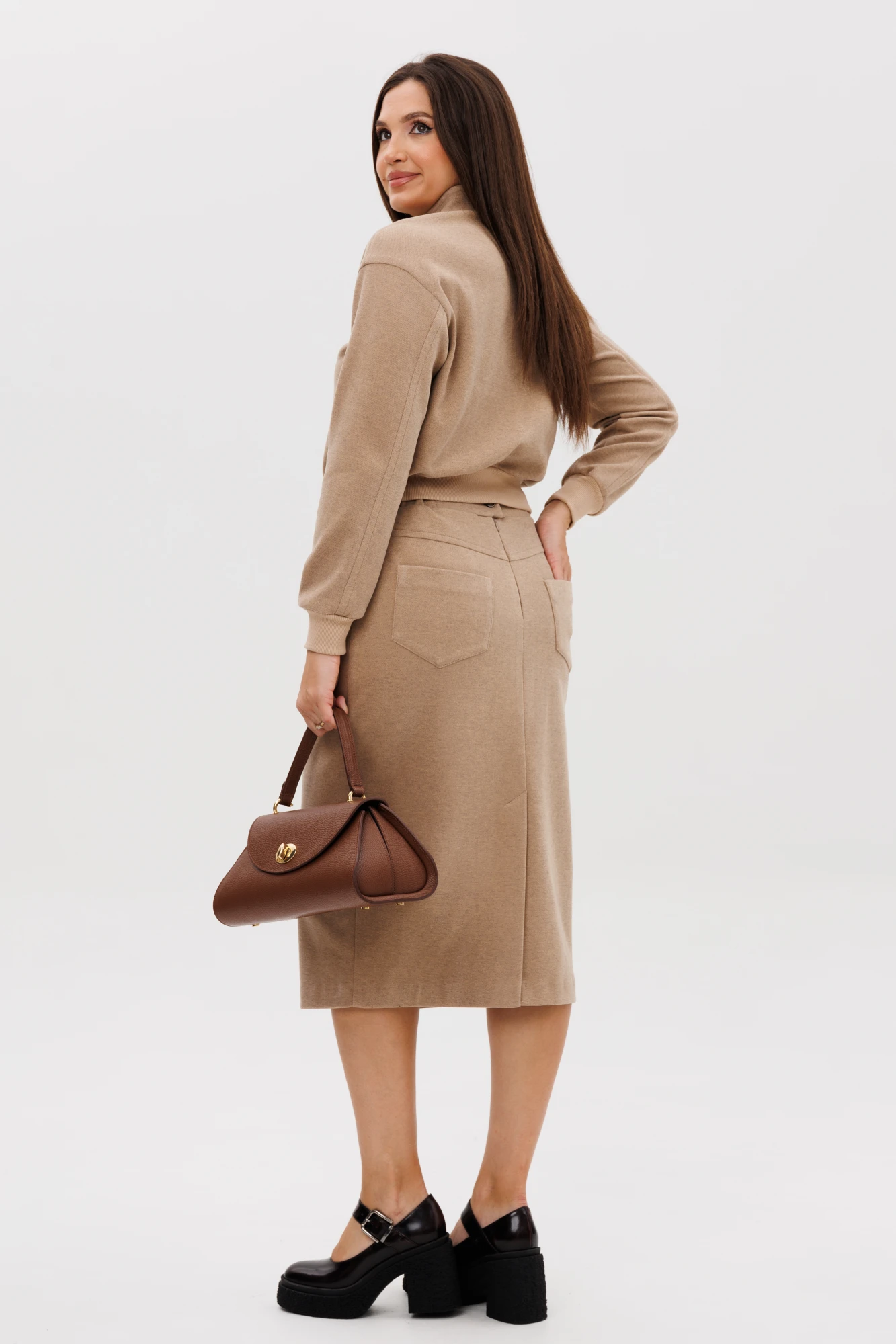 "Женские костюмы уже давно стали ответом на вопросы стиля. Костюм - это уже готовый завершенный образ. Один из модных трендов сезона - сочетание юбки длинны миди и укороченного жакета. Модная расцветка, свободный покрой с заниженной линией плеча, воротник - стойка, переходящая в фигурную линию борта. Застежка - двубортная на пуговицы. По низу жакета и рукавов - трикотажный эластичный довяз. Юбка прямая, на передних половинках боковые наклонные карманы. На задних половинках кокетки и накладные карманы в направлении под углом 45 градусов и высокая шлица.