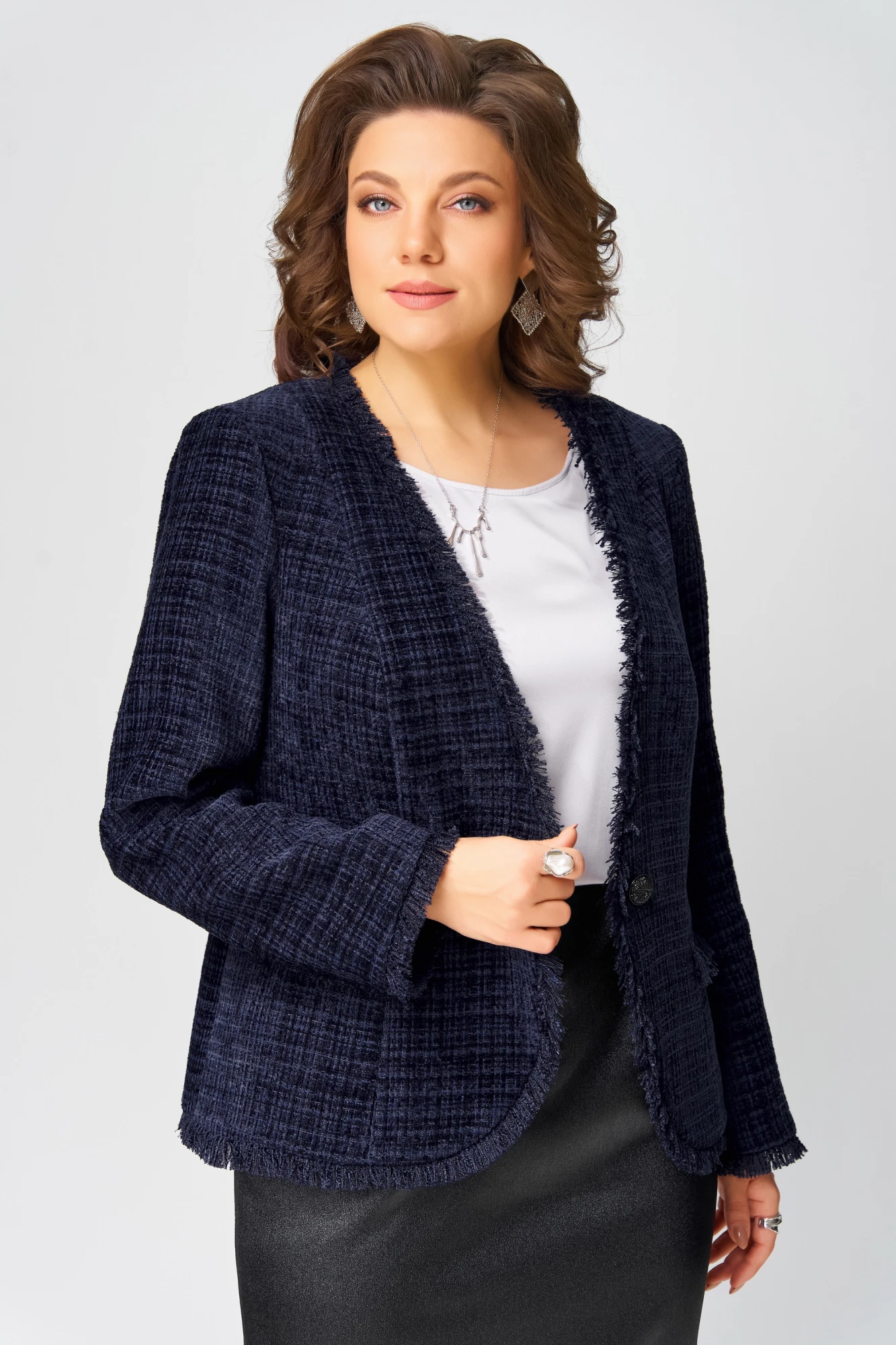 Жакет выполнен из твидовой ткани на подкладке полуприлегающего силуэта. Застежка в жакете однобортная на пуговицу, по полочке - рельефы, карман-обманка в виде настроченной трепки, по спинке рельефы. По краю борта и низа жакета вставлена трепка, рукав втачной двухшовный, по низу рукава вставлена трепка.