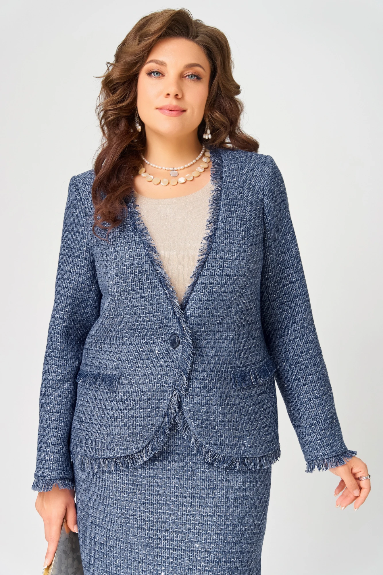 Жакет выполнен из твидовой ткани на подкладке полуприлегающего силуэта. Застежка в жакете однобортная на пуговицу, по полочке - рельефы, карман-обманка в виде настроченной трепки, по спинке рельефы. По краю борта и низа жакета вставлена трепка, рукав втачной двухшовный, по низу рукава вставлена трепка.