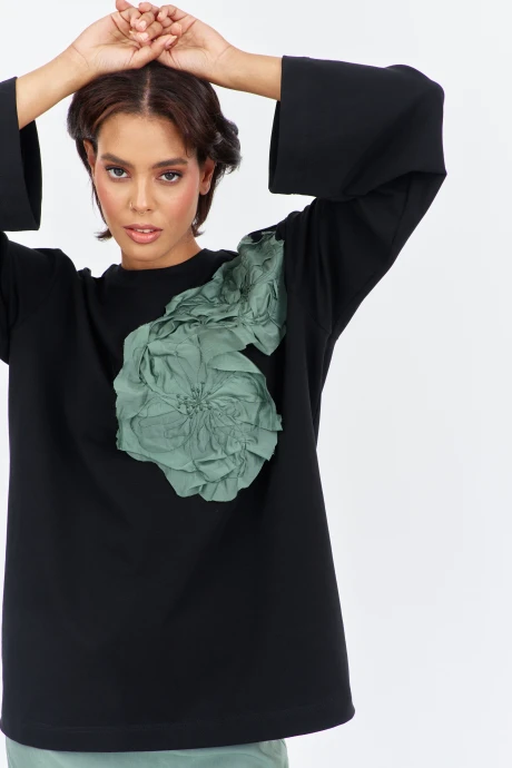 Комплект джемпер свободного силуэта со спущенным рукавом с юбкой. Характеристики: выполнена из трикотажного полотна в черном цвете, по переду декоративная вышивка, горловина обработана планкой, рукав прямой, спущенный. Длина джемпера по переду 74 см, длина рукава 60 см. Юбка выполнена из блузочной ткани в цвете зеленый мох, пояс обработан эластичной тесьмой (резинкой), по заднему полотнищу юбки обработан разрез. Длина юбки по боковому шву 95 см.