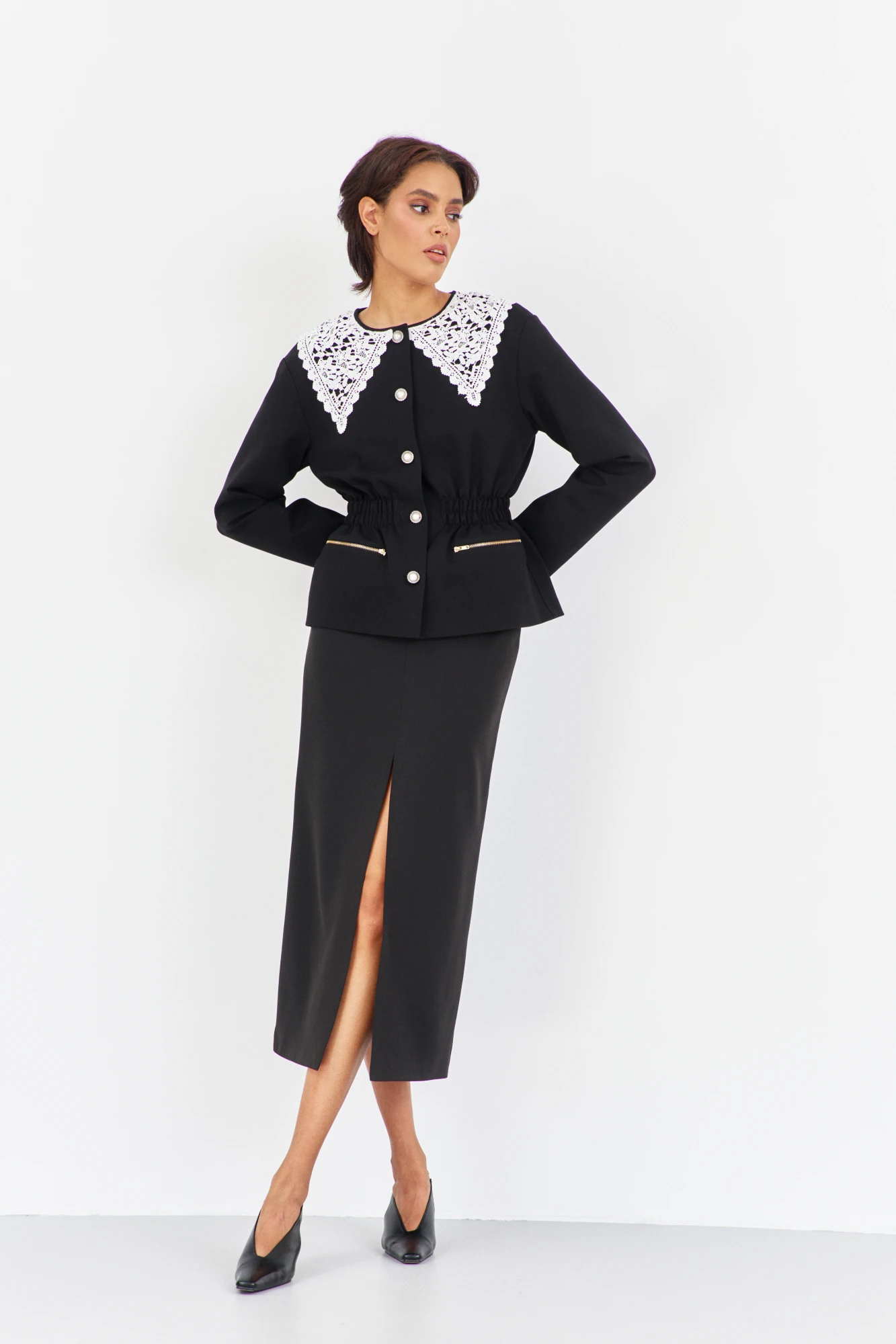 Комплект жакет с декоративным хлопковым воротнииком с юбкой. Жакет приталенного силуэта с карманами по переду и хлопковым воротником. Характеристики: выполнен из костюмно-плательной ткани в черном цвете, центральная застежка на кнопки, по талии резинка, на подкладке. Юбка прямого силуэта в длине миди. Характеристики: выполнена из костюмной ткани в черном цвете, по центру переда разрез, юбка на подкладке, застежка-молния по заднему полотнищу юбки, верх юбки обработан поясом-обтачкой. Длина юбки 93,5 см. Длина жакета по переду 62 см, длина рукава 60 см.
