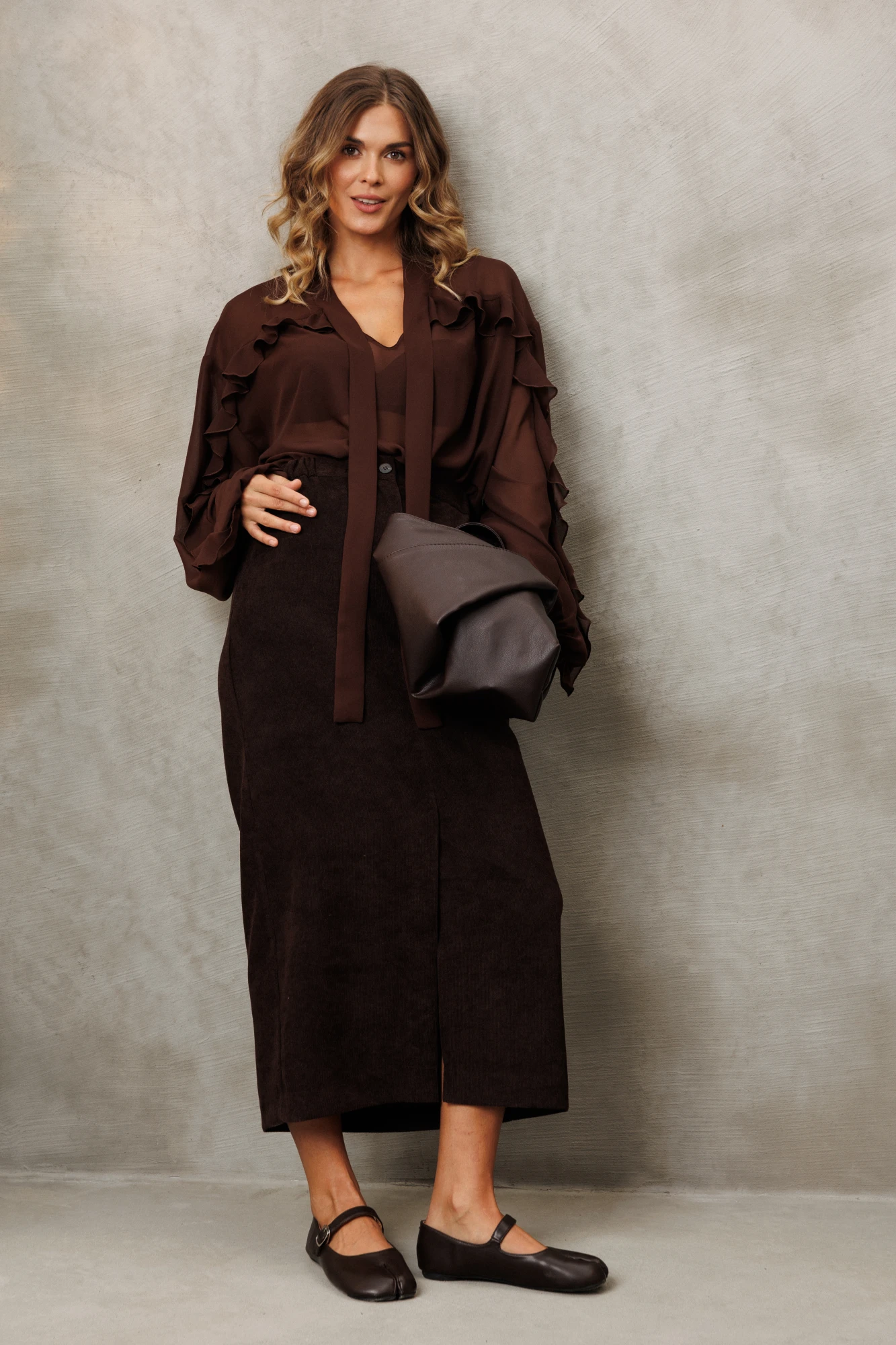 Костюм состоит из блузки и юбки. Блузка свободного силуэта из струящейся шифоновой ткани. Перед и спинка с кокеткой и сборкой. Рукав спущенный свободный с резинкой понизу. Вдоль линии кокетки и рукава вставлена рюша. Горловина V-образной формы с воротником стойкой переходящей в бант. Длина блузки - 67 см, длина рукава - 60 см. Юбка прямого силуэта выполненная из мягкой вельветовой ткани. Передняя честь юбки с вытачками, со средним швом и застежкой гульфиком на молнии и щлицей спереди. Задняя часть юбки с вытачками. Юбка на притачном поясе с затежкой на петлю и пуговицу спереди и резинками по бокам. Юбка на подкладке. Длина юбки с учетом пояса - 90 см.