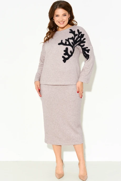 Костюм женский, состоящий из джемпера и юбки. Джемпер полуприлегающего силуэта из мягкого трикотажного полотна с добавлением ангоры со втачными немного спущенными рукавами и округлым вырезом горловины. По переду дизайнерская вышивка. Юбка полуприлегающего силуэта, зауженная книзу, на эластичной подкладке с притачным поясом на резинке; по спинке шлица. Рекомендована бережная стирка при t 30; глажение при максимальной температуре прессующей поверхности утюга не более 110 С.