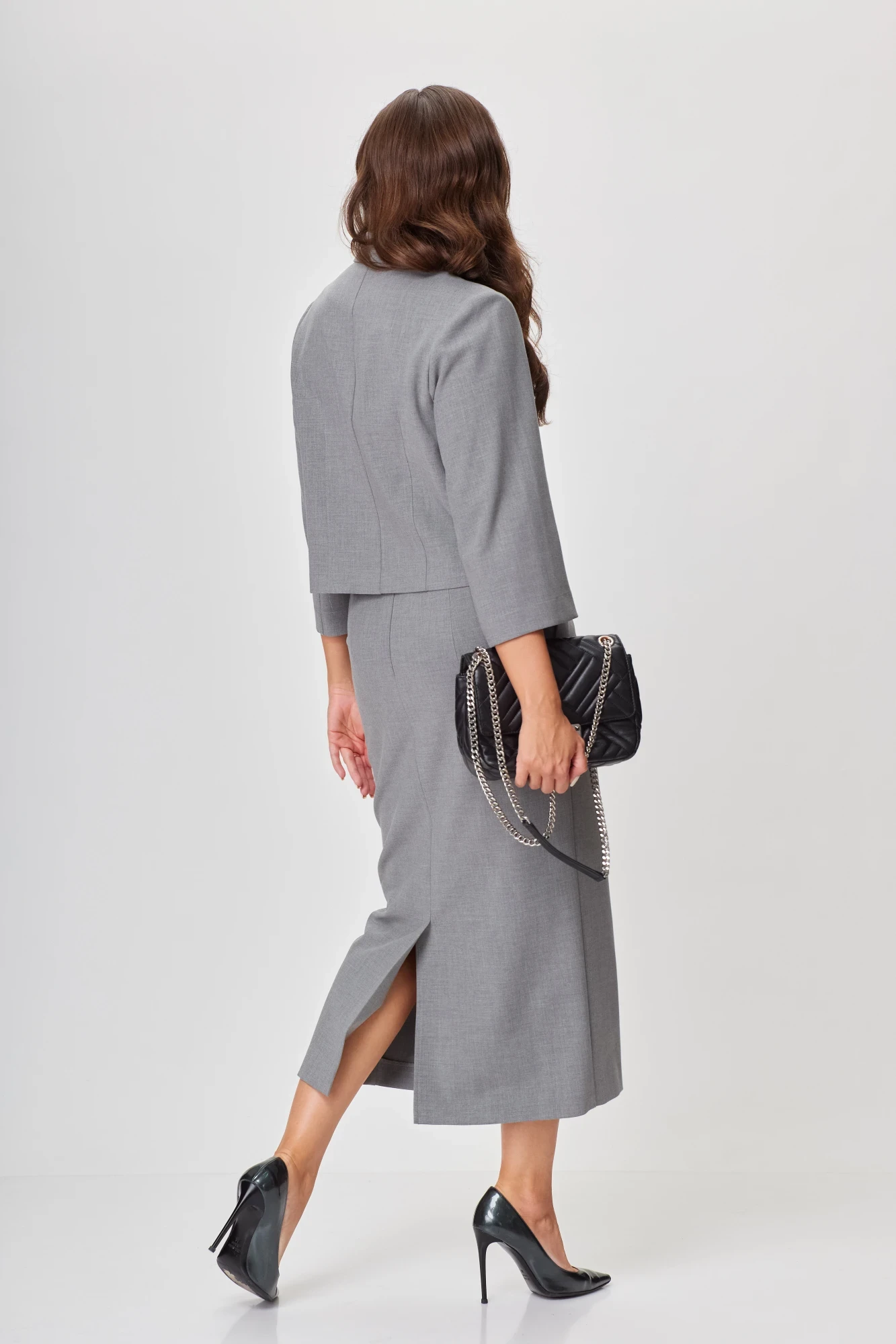 Стильный костюм в деловом стиле, состоит из жакета и юбки. Жакет прямого силуэта, рукав втачной, застёжка центральная на петли и пуговицы, воротник отложной. По переду ввполнен декоративный карман в рамку с фигурной отстрочкой. Рукав прямой чуть расширен к низу. Жакет без подкладки. Юбка прямая на подкладке с застроченными декоративными кантами по переду. Пояс притачной, частично на резинке. В боковых швах карманы. По спинке средний шов с высокой шлицей для хода. Застежка в среднем на потайную молнию и пуговицу