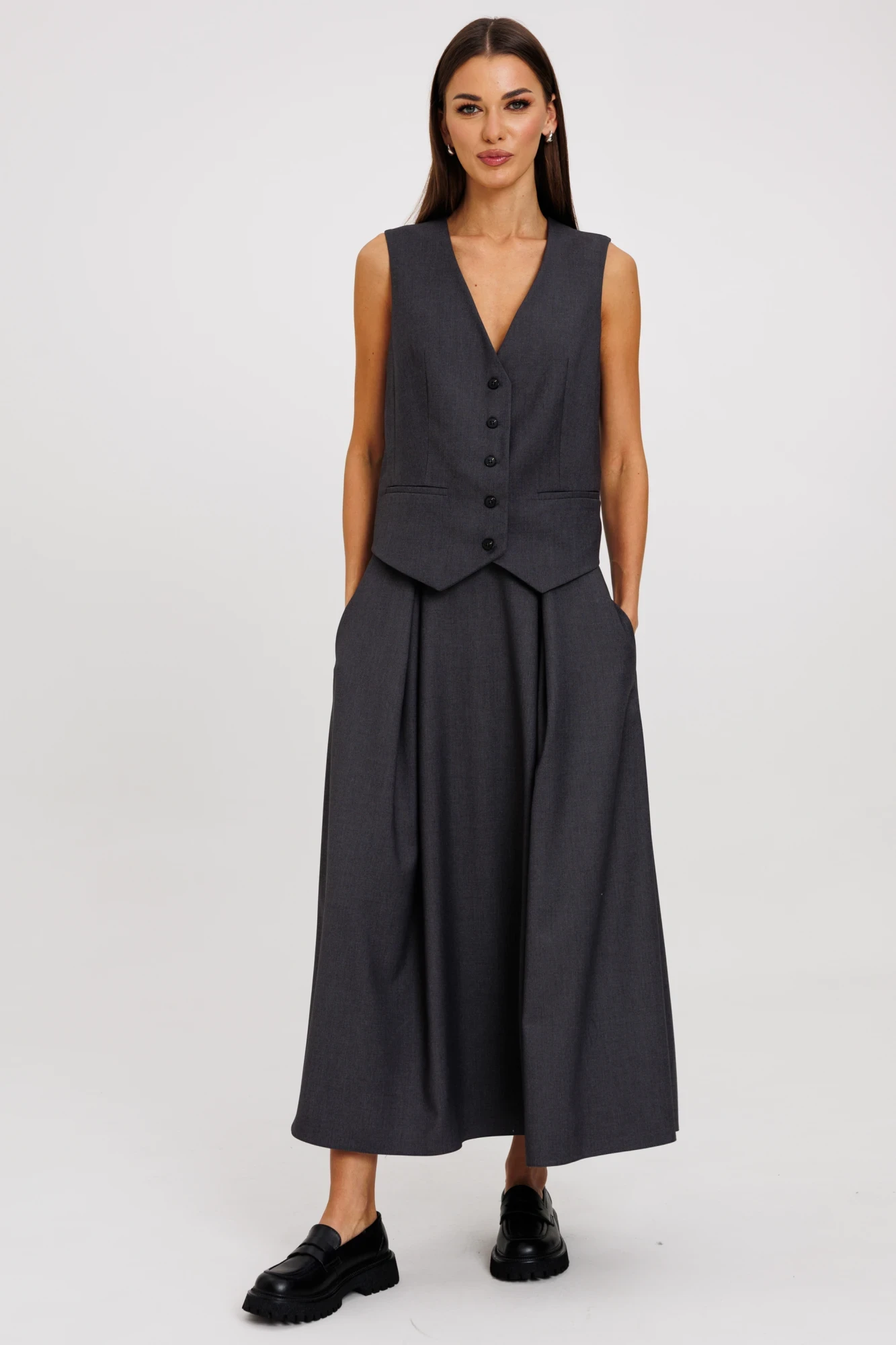 Этот эксклюзивный костюм, состоящий из классического жилета с пятью пуговицами и прорезными карманами и удлиненной юбки-трапеции из костюмной ткани с боковыми карманами и изящными встречными складками, — идеальное сочетание элегантности и практичности. Жилет, украшенный пуговицами, добавляет нотку аристократической изысканности, а карманы делают его не только стильным, но и удобным. Юбка-трапеция создает утонченный и женственный образ, в то время как карманы и складки добавляют элемент загадочности и шарма. Этот костюм — воплощение времени и моды, которое будет привлекать восхищенные взгляды и вызывать восхищение своим утонченным стилем и вниманием к деталям.