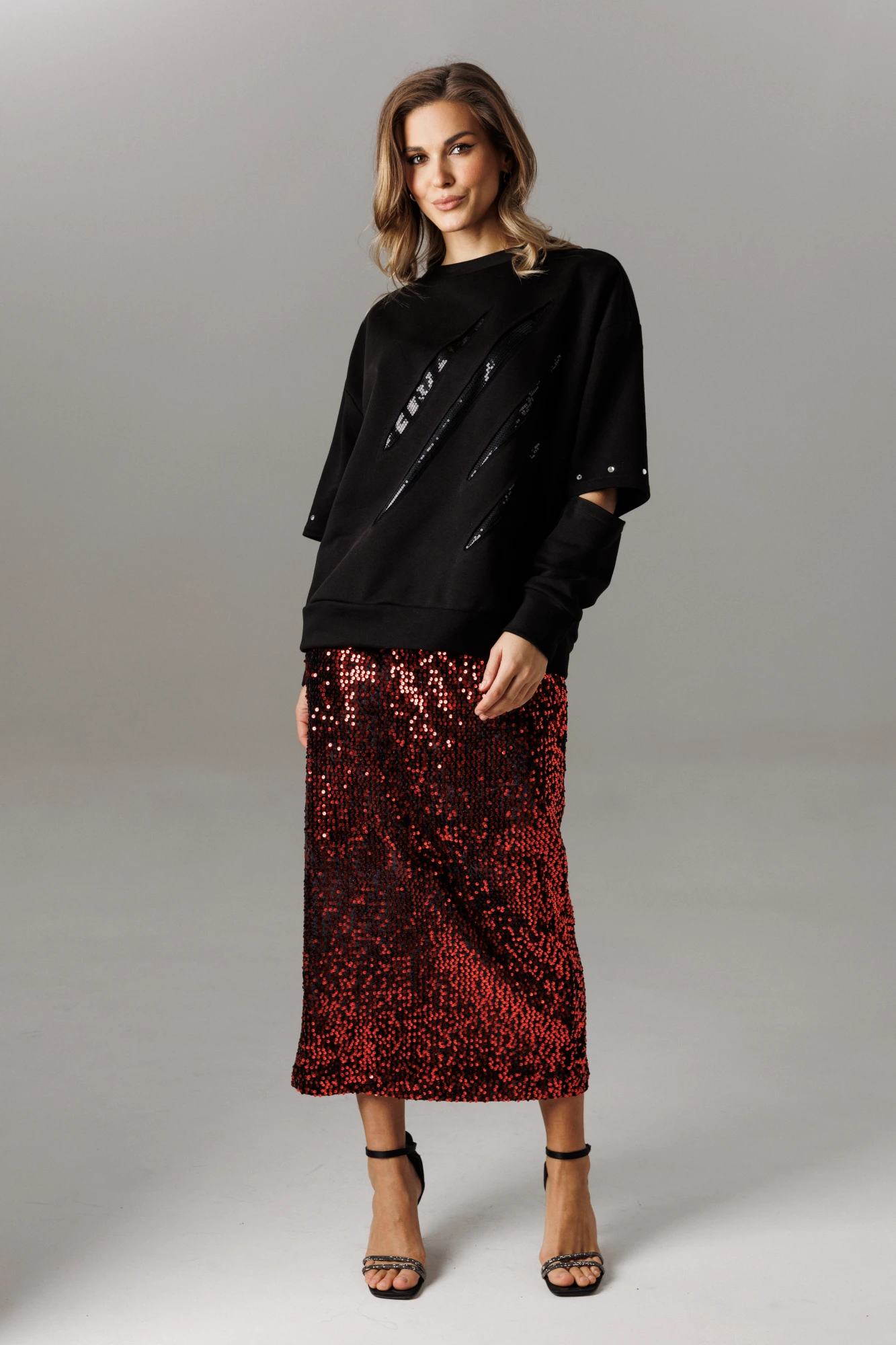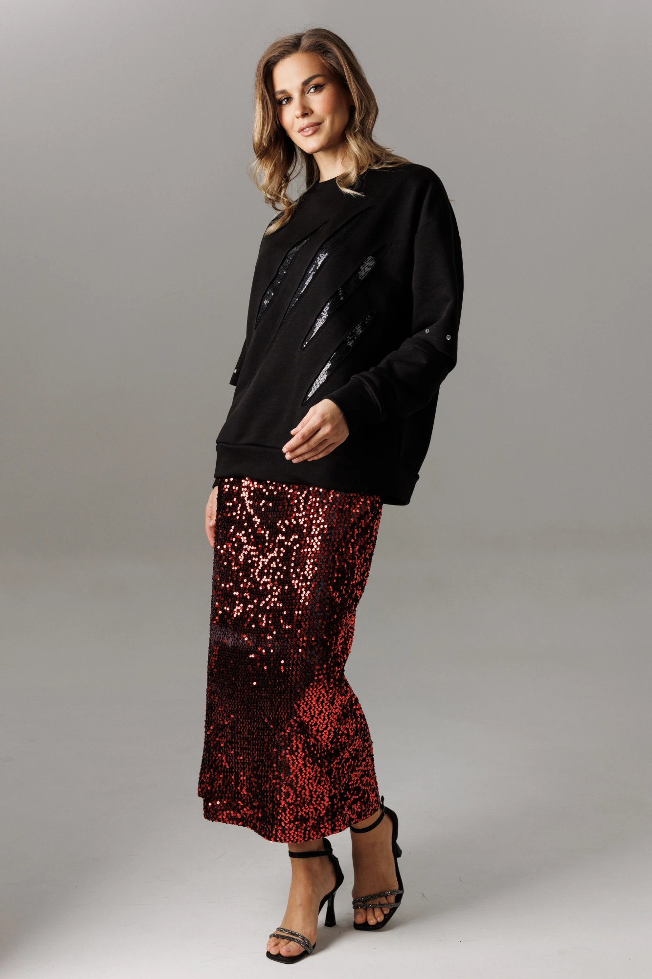 Юбка комплекта из эффектного трикотажного полотна на основе велюра с пайетками в стиле «карандаш» на подкладке, чуть зауженная к низу. В среднем шве расположены потайная молния и открытый разрез, высотой 32 см. На линии талии расположены классические вытачки, пояс внутренний, обтачной. Длина изделия по среднему 82-83 см.